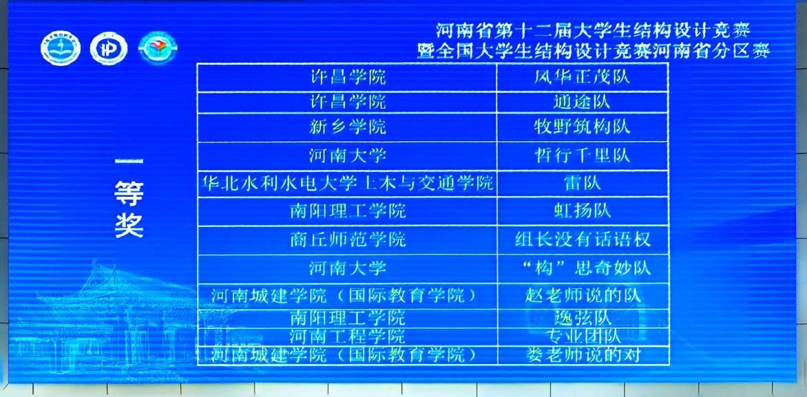 大学生结构设计竞赛是土木工程领域级别最高、影响最大的大学生综合性学科竞赛。本次比赛共有来自郑州大学、河南大学、河南理工大学、河南工业大学、华北水利水电大学等省内31所高校的76支队伍、300多名学生同台竞技。我校土木工程学院赵亚磊、王丹妮、王荔超、田文武、邱红桥、张胜等6名学生组成的两支代表队,在张磊、李凯等老师的指导下,经过认真备赛和稳定发挥,最终以总成绩前两名获得2项一等奖,展现了扎实的专业功底和优秀的创新能力。这也是我校连续三年荣获省赛一等奖。