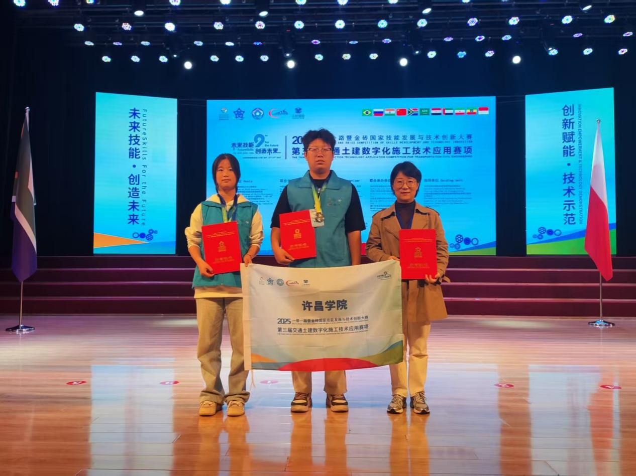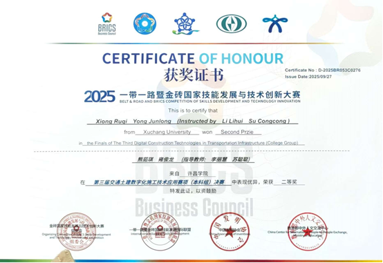 近日,2025“一带一路”暨金砖国家技能发展与技术创新大赛——第三届交通土建数字化施工技术应用赛项决赛在哈尔滨举行,土木工程学院道路桥梁与渡河工程专业2022级学生熊茹琪、雍俊龙获得本科组团队二等奖。