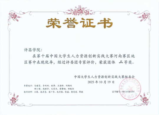 近日,第十届中国大学生人力资源创新发展大会河南赛区在河南科技学院成功举办,作为国家级重要学科竞赛,本届大赛吸引了众多高校的人力资源管理专业学子同台竞技。许昌学院商学院人力资源管理专业参赛团队在指导老师的带领下,积极备战、奋勇争先,最终斩获一等奖1项、二等奖5项,并荣获团体二等奖。