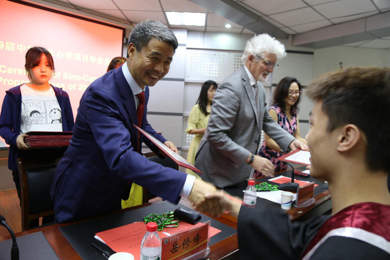 许昌学院院长岳修峰与荷兰学院院长Sandy McDonald共同向毕业生们颁发了毕业证书、荷兰学院2019年度合作办学奖学金及纪念品。(摄影:宁智沛)