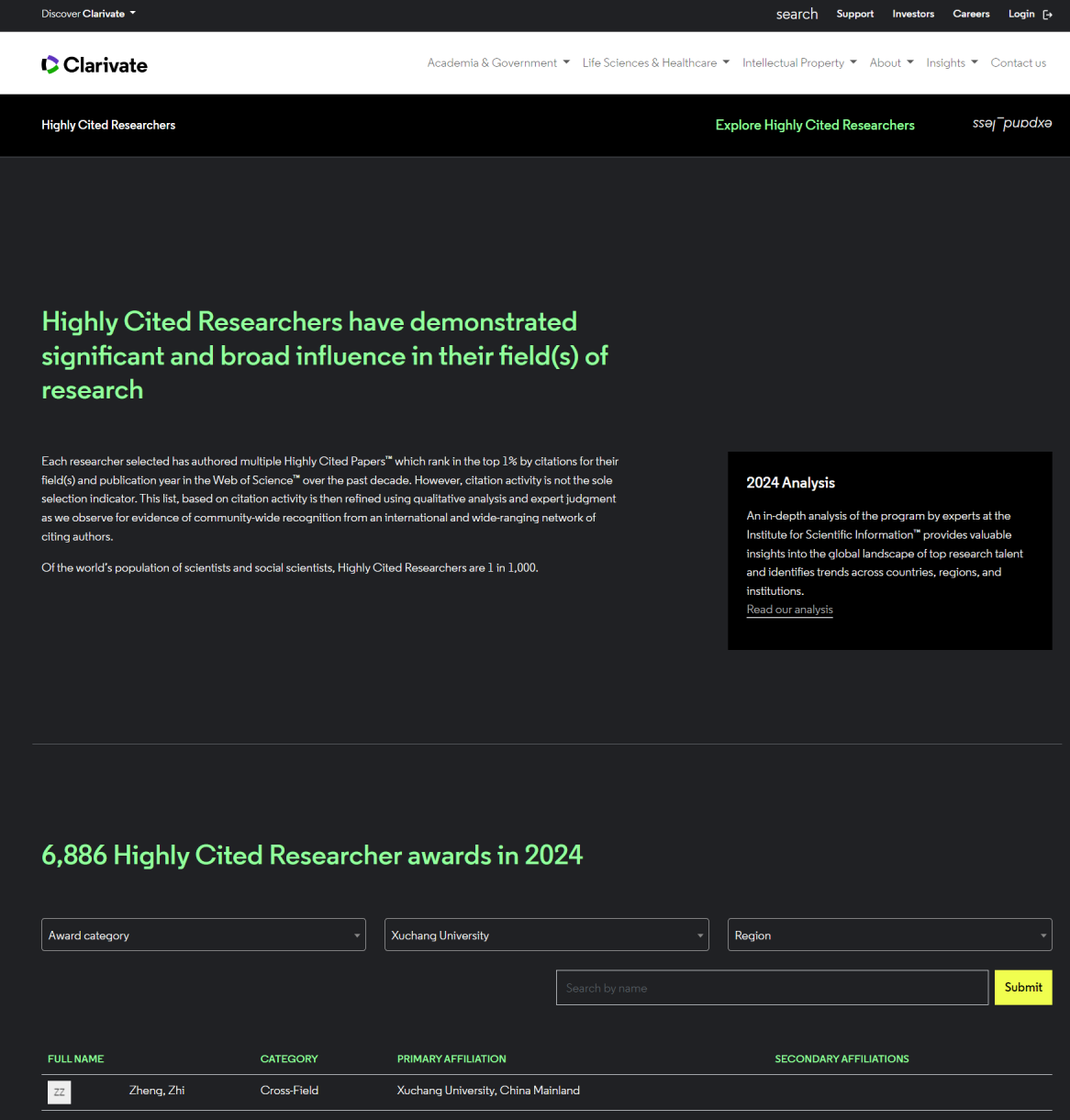 近日,科睿唯安(Web of Science数据库)、美国斯坦福大学(Stanford University)先后发布了2024年度“全球高被引科学家”名单和2024全球前2%顶尖科学家榜单(World's Top 2% Scientists)。其中,我校校长郑直教授入选2024年度“全球高被引科学家”(“交叉学科”领域),成为我校首位入选“全球高被引科学家”榜单的学者,化工与材料学院(表面微纳米材料研究所)许志红教授与何伟伟教授两位学者入选化学领域2024年度科学影响力榜单,其中何伟伟教授也是连续五年入选全球前2%顶尖科学家榜单。