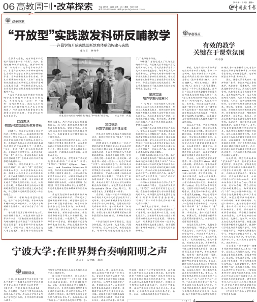 【编者按】当前,全面深化改革、着力内涵发展,建设富有特色的高水平应用型大学成为学校提速发展的新航标,培养具有创新精神的高素质应用型人才,凸显“内涵提升、改革创新、开放融合”三大战略,实施教育教学质量提升、学科专业提质、人才队伍汇聚、办学特色凝练、大学文化厚植、治理能力提高六大工程,成为今后较长一段时间全校上下凝心聚力、克难攻坚的新命题。近期,党委宣传部(新闻中心)在校内各媒体平台推出“守初心 担使命 内涵提升在行动”专题系列报道,深入走访、融媒报道学校各单位在党建与思政教育、教育教学改革、产教融合、应用型人才培养、创新引领、文化传承、校园文化、管理服务等方面的新思路、新理念、新经验、新成果,为全校师生鼓足干劲建设富有特色的高水平应用型大学凝聚力量。本期推出第四篇《“开放型”实践激发科研反哺教学——许昌学院开放实践创新教育体系的构建与实践》,该文刊发于《中国教育报》2019年11月4日第6版。