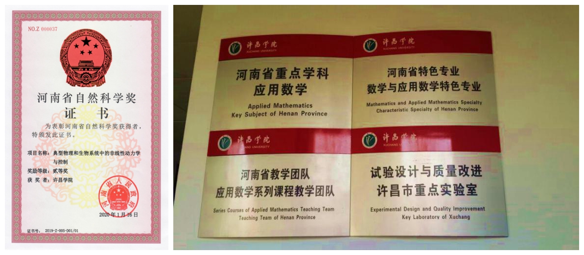 图5 河南省自然科学二等奖证书(左)、应用数学学科建设部分平台(右)