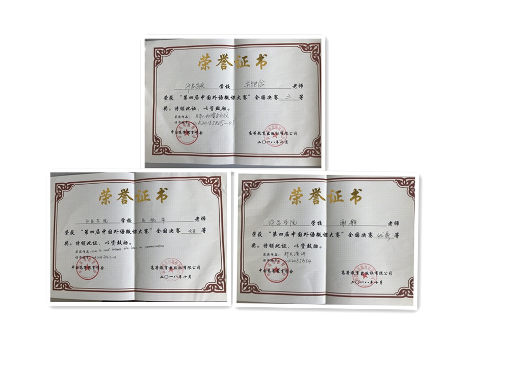 2018年10月18日,在成都召开的第四届中国外语微课大赛颁奖典礼传来佳讯,我校外国语学院关铠含老师的《日本人的赠答礼仪》获全国总决赛本科日语组三等奖,员艳萍老师、谢静老师的《How to Read Between the Lines in Communication》,《即兴演讲 Impromptu Speech》分获本科英语组优秀奖。三位获奖老师的微课作品从选题到课程设计,从教学理念的渗透到教学基本功展示,从视频呈现设计到视频模态动画的选择,从教案编写到课后作业的处理等多个环节都得到了专家评委的一致认可和好评。
