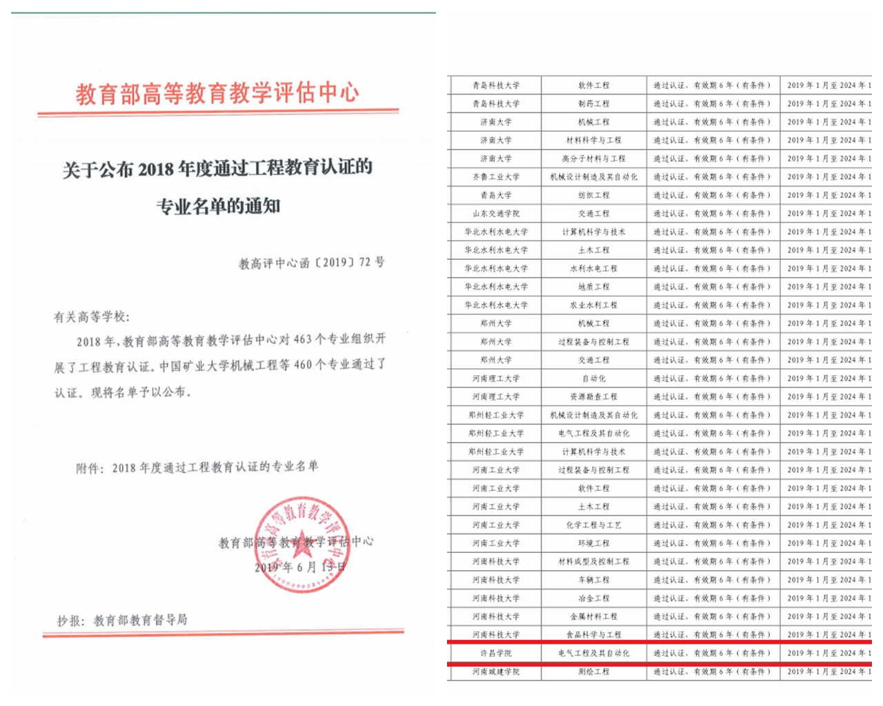 6月13日和16日,教育部高等教育教学评估中心、中国工程教育专业认证协会分别下发了《关于公布2018年度通过工程教育认证的专业名单》和《关于公布北京工业大学机械工程等460个专业认证结论的通知》,公布了2018年参加全国工程教育专业认证的部分专业认证结果,我校电气工程及其自动化专业顺利通过工程教育专业认证,有效期为2019年1月至2024年12月。