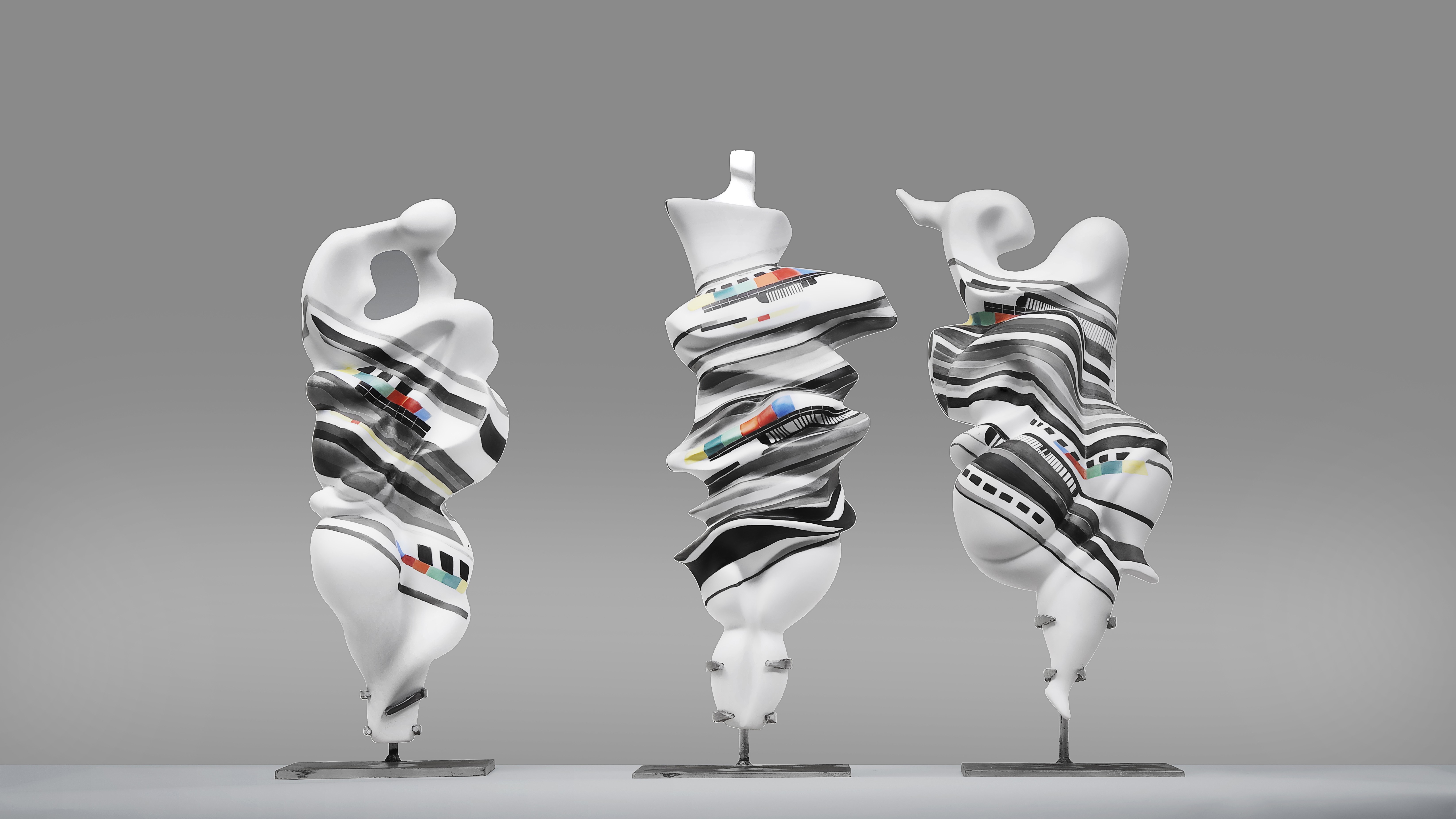 郭君健作品《线释经纬》通过三个抽象形态来提炼人生的三种状态即遇到挫折后的卧薪尝胆与反思、重建人生目标后的坚毅守望、坚守信念后获得成功的欢愉。作品运用黑白灰线条诠释跌宕起伏的人生经历,用极富韵律的黑白灰线条与色彩纯净的色块进行穿插点缀,突出了作品的当代性和现代感。(图片由设计艺术学院提供)