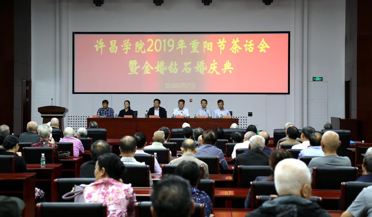 “飞火流霞迎盛世,欢歌笑语贺华章”。在举国上下喜迎中华人民共和国成立70周年之际,我们又将迎来传统敬老节日——重阳节。27日上午,学校在创新创业学院学术会议中心举行了2019年重阳节茶话会暨金婚钻石婚庆典。校党委书记闫纪建、校工会主席高金星出席,党政办公室、组织部、离退休工作处负责同志和4对金婚钻石婚伉俪、百余名离退休老同志参加。茶话会暨金婚钻石婚庆典由离退休工作处党总支书记马廷杰主持。