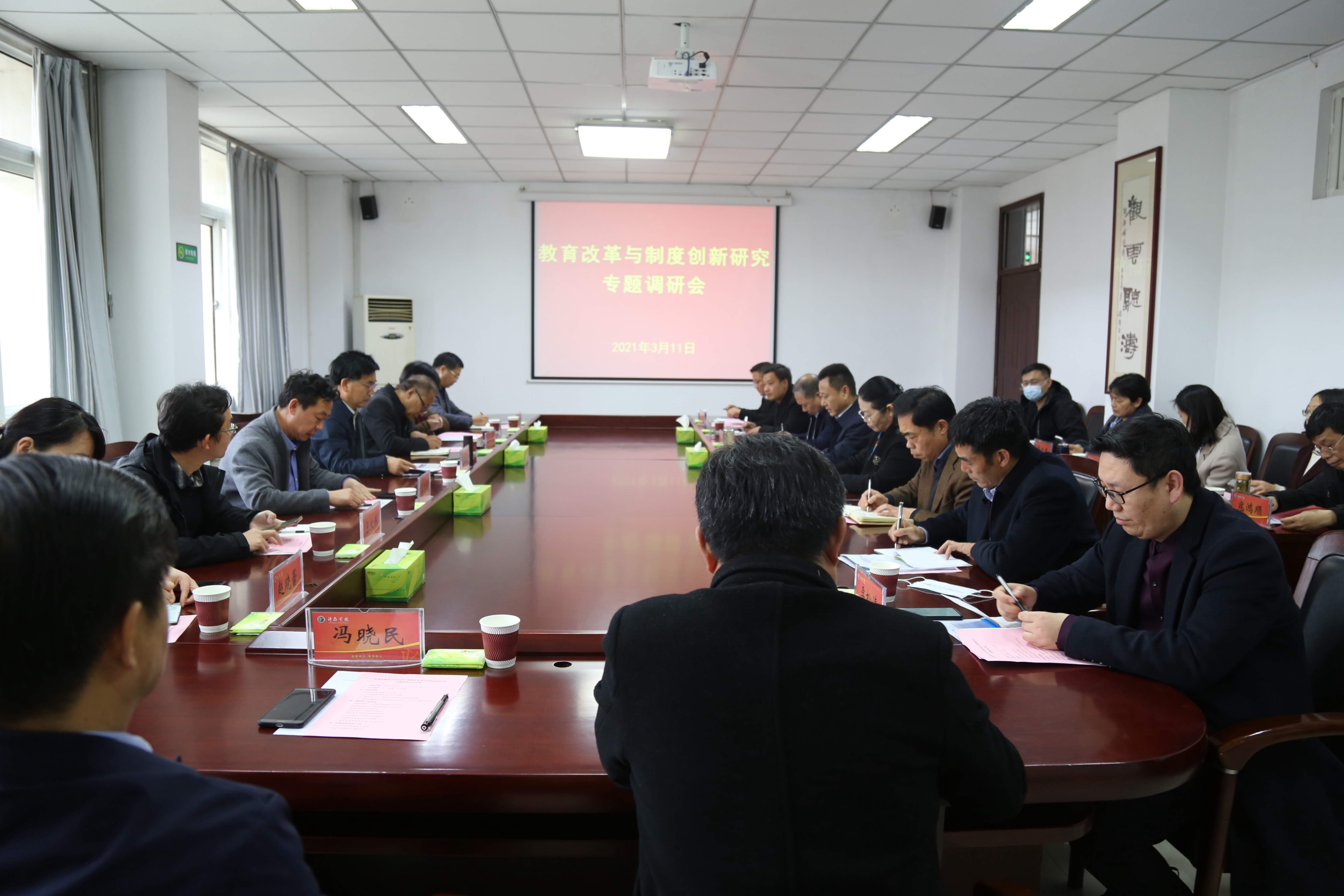 根据《河南省教育事业发展“十四五”规划编制工作方案》要求,3月11日下午,河南省教育厅教育改革与制度创新研究调研组第二组组长、省教科院副院长周宝荣一行8人到许昌市高校进行专题调研。院长岳修峰热情接待了调研组一行。调研座谈会在我校办公楼第一会议室召开。我校党委副书记孙海、副院长潘春彩,许昌职业技术学院副院长郭长庚,许昌电气职业学院副院长冯朝印,许昌陶瓷职业学院董事长高国召、党委书记肖绍俊、副院长王中亚等出席座谈会。会议由我校党委副书记孙海主持。