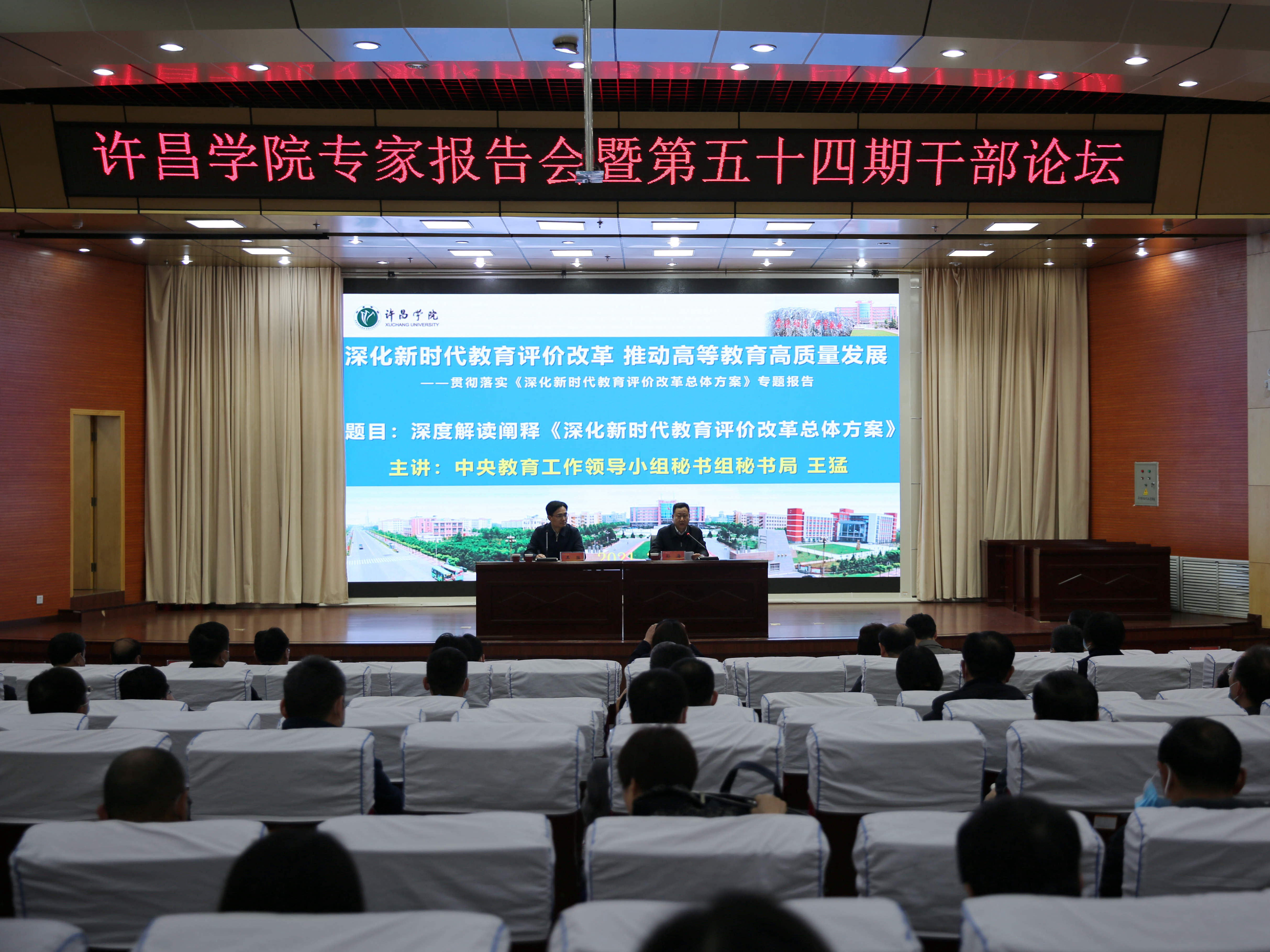 3月27日上午,我校在图书馆二楼学术报告厅举办《深化新时代教育评价改革总体方案》(以下简称《总体方案》)专家报告会暨第五十四期干部论坛。报告会特邀中央教育工作领导小组秘书组秘书局副局长王猛主讲。校党委副书记孙海,副院长郑直、崔斌、潘春彩出席报告会,全体中层干部参加会议并听取报告。会议由党委副书记孙海主持。
