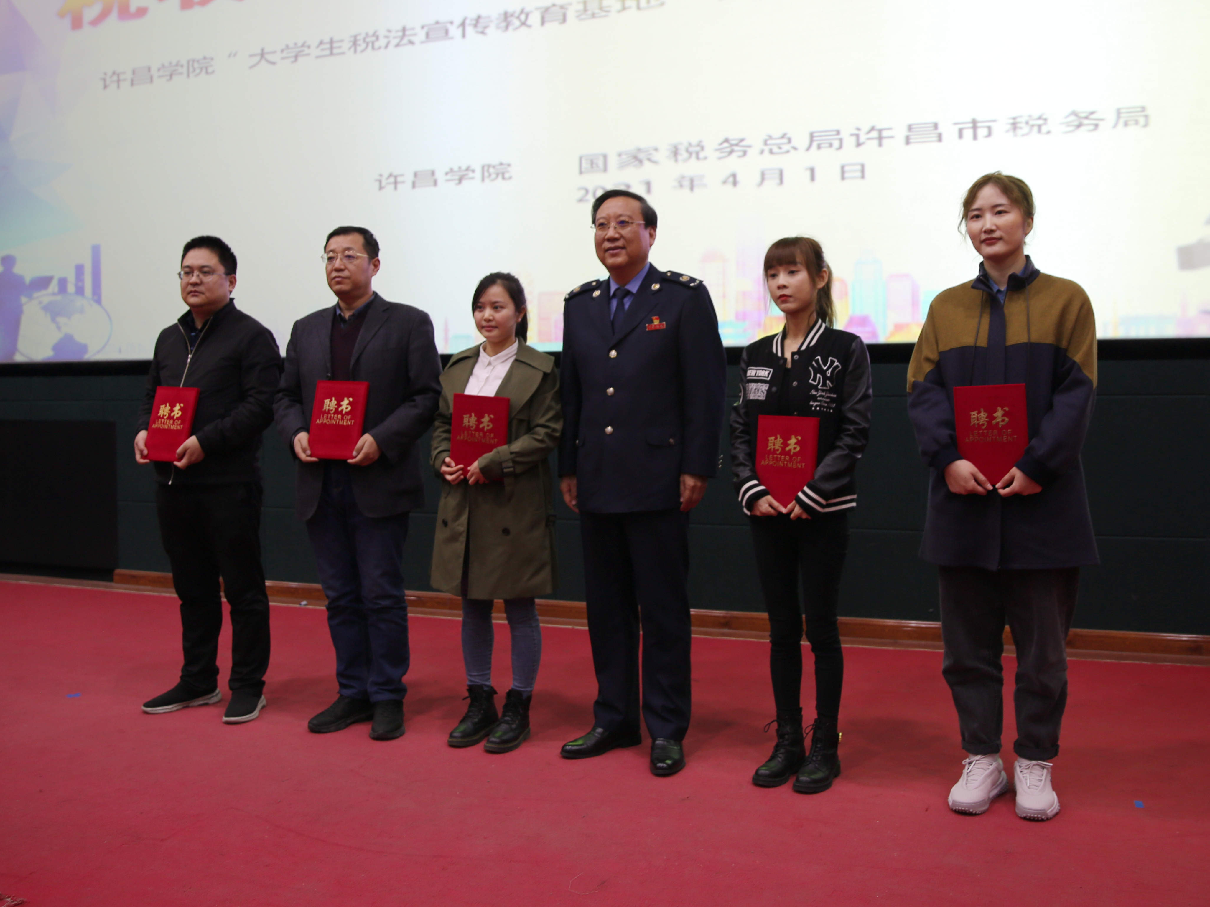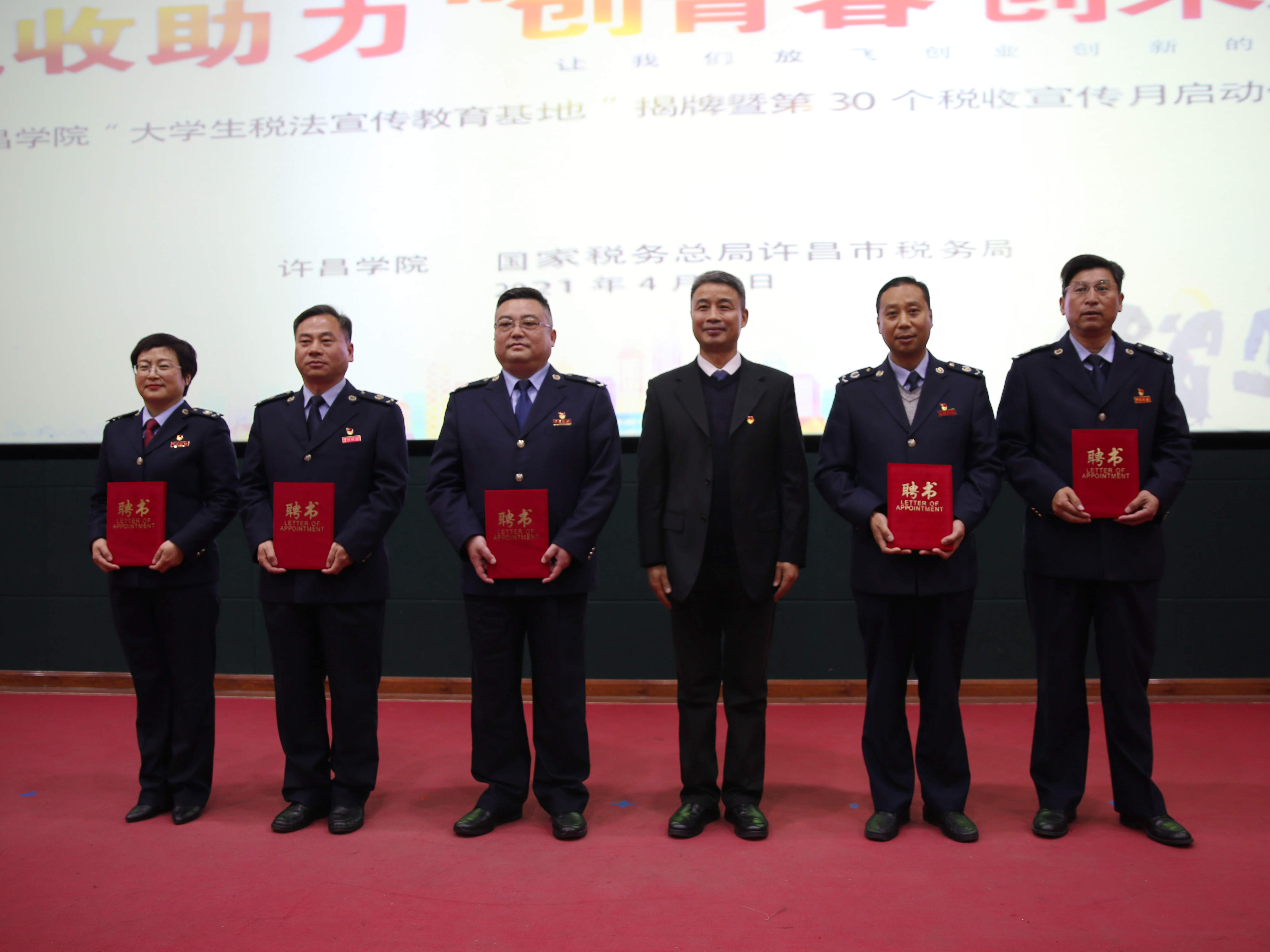 许昌学院院长岳修峰为5名“税收法律政策辅导员”颁发聘书
