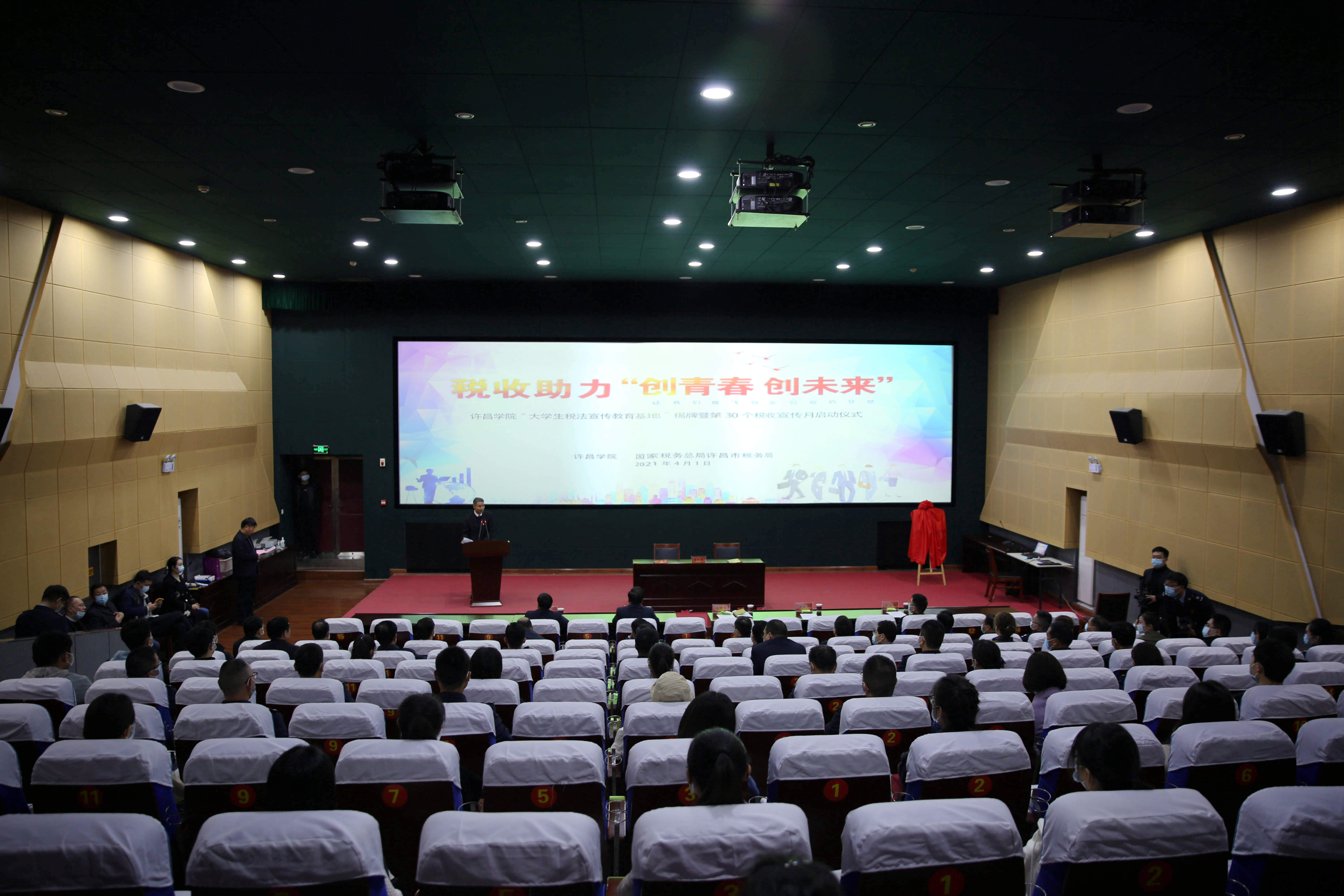 4月1日上午,由许昌学院、国家税务总局许昌市税务局联合设立的“大学生税法宣传教育基地”在我校创新创业中心揭牌,同时,以“税收惠民办实事 深化改革开新局”为主题的第30个税收宣传月正式启动。许昌学院院长岳修峰,副院长周新峰,国家税务总局许昌市税务局党委书记、局长宋彬,党委委员、副局长夏红伟,党委委员、总会计师常明伟出席仪式。仪式由许昌学院副院长周新峰主持。