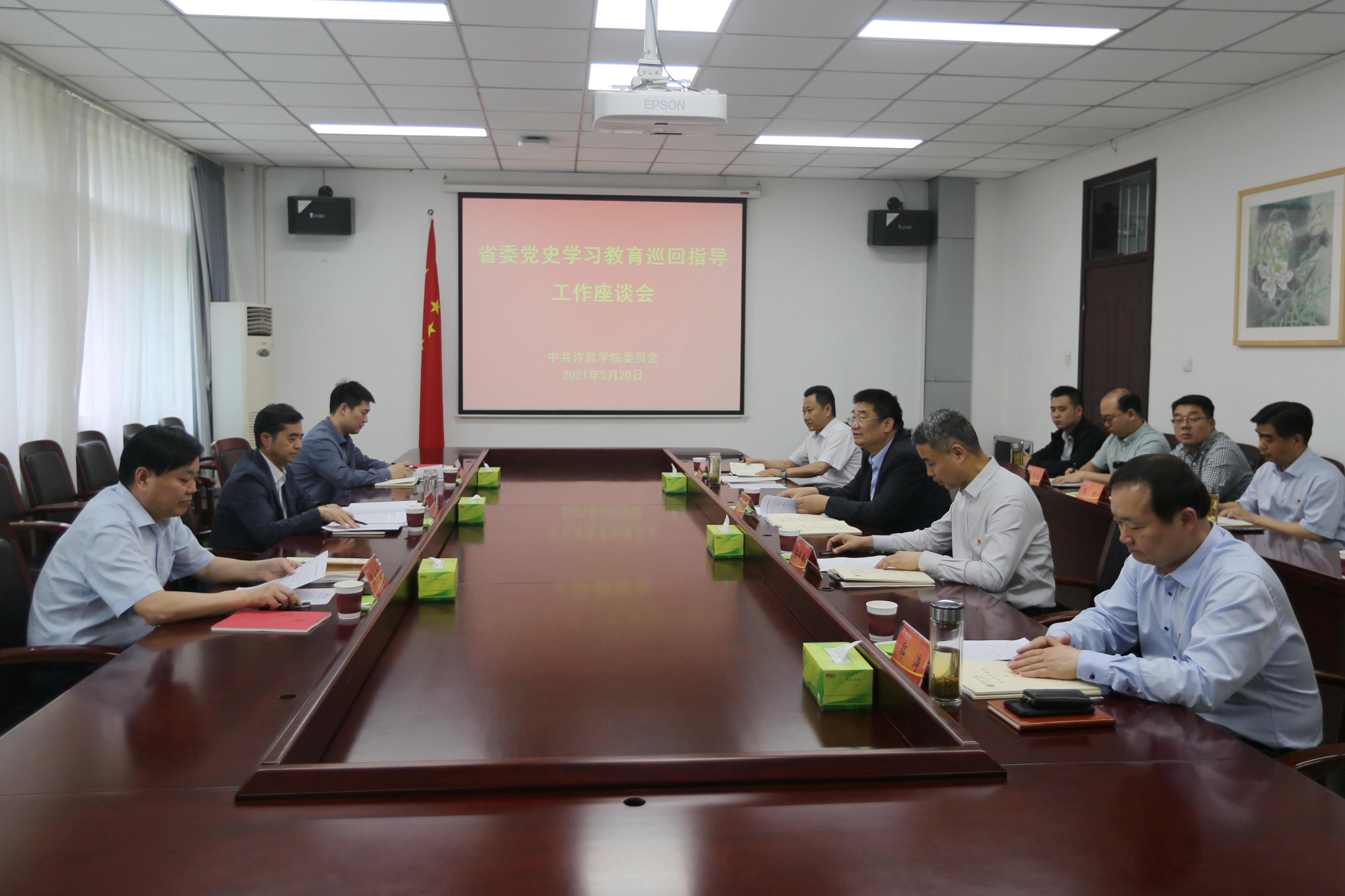 按照省委统一安排,5月20日下午,省委党史学习教育第九巡回指导组副组长、中原出版传媒集团有限公司党委委员、副总裁张培明,指导组成员、省总工会煤矿工会四级调研员任文重一行到我校调研指导党史学习教育工作。巡回指导工作座谈会在办公楼第四会议室举行。我校党委书记闫纪建,党委副书记、院长岳修峰,党委副书记孙海,党委副书记、工会主席郭涛,许昌市委宣传部副部长廖少忠出席会议。我校党史学习教育领导小组办公室相关负责同志参加会议。会议由院长岳修峰主持。