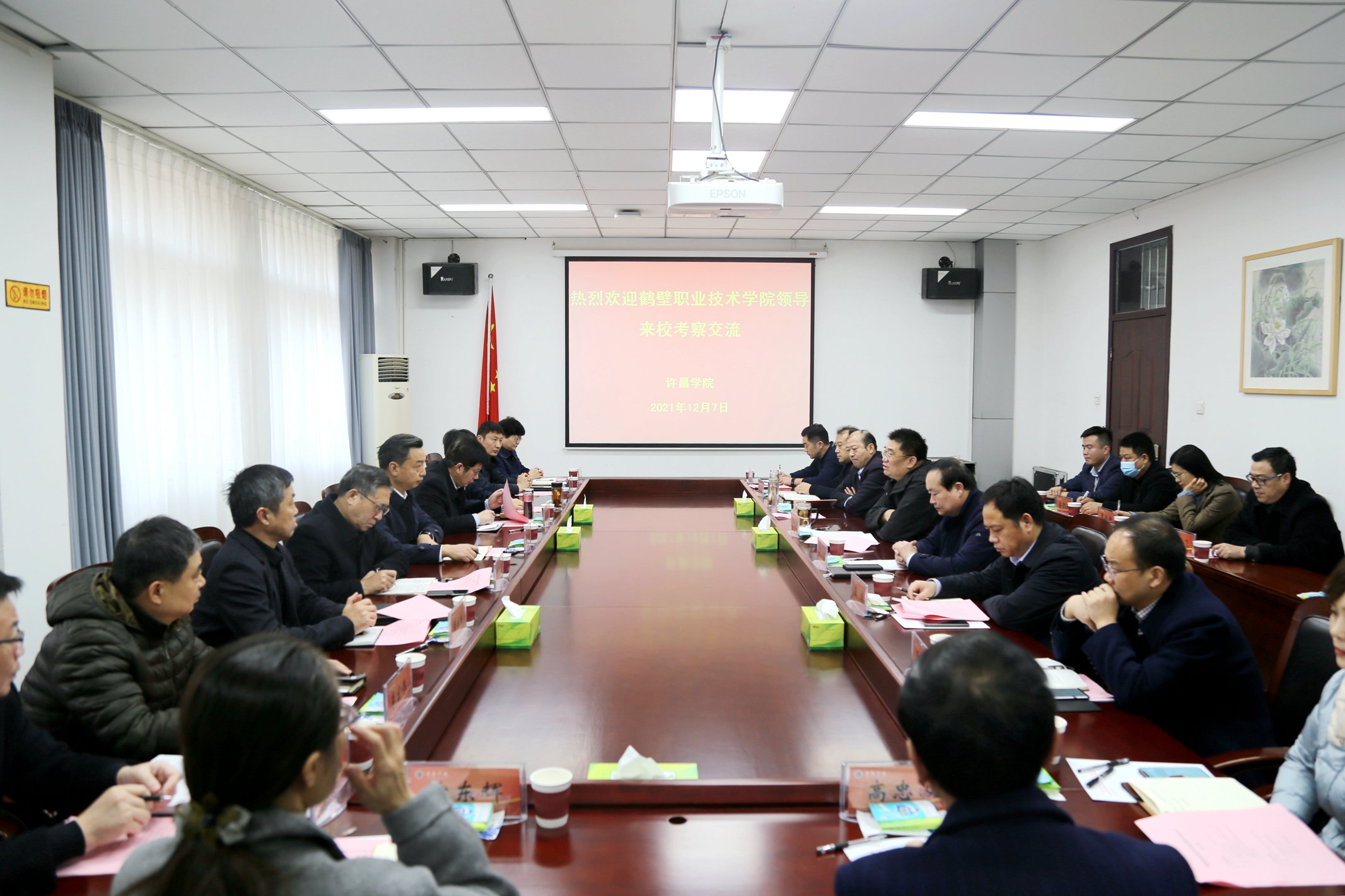 12月7日下午,鹤壁职业技术学院党委书记孙斌、党委副书记赵勇带领相关部门负责同志一行17人,来我校考察交流。我校党委书记闫纪建,院长岳修峰,党委副书记、工会主席郭涛,副院长崔斌热情接待了来访客人。