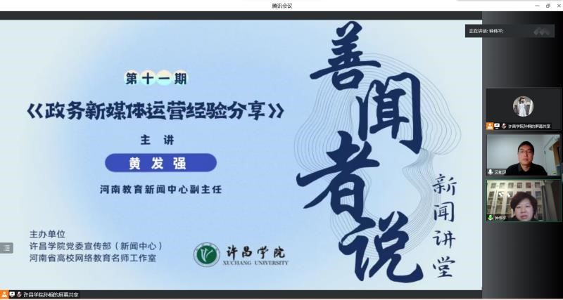 近日,由学校党委宣传部(新闻中心)主办、河南省高校网络教育名师工作室承办的第10期、第11期“善闻者说”新闻讲堂在腾讯会议网络平台上开展,活动特邀河南省教育融媒体运营中心副主任刘棒、河南教育新闻中心副主任黄发强为我校师生作专题讲座。学校各单位新媒体宣传队伍、校媒团队、网络文化工作室指导教师及学生骨干共约600人次参与学习。