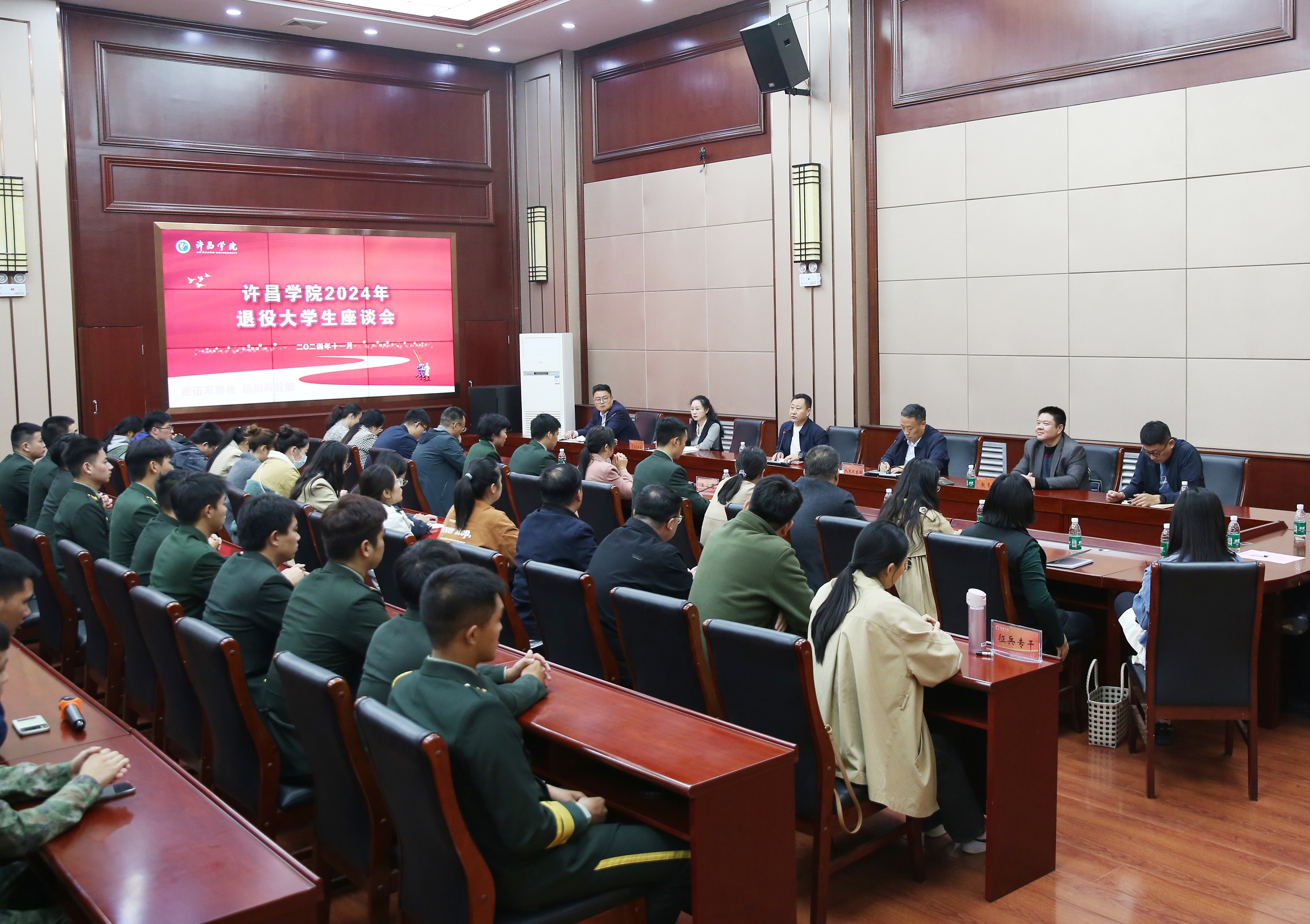11月1日下午,我校在学术会议大厅召开2024年退役大学生座谈会。校党委副书记孙海出席会议,学校相关职能部门负责人,学院(社区)党委副书记、征兵专干、全体2024年复学和新入学退役大学生参加座谈会,会议由校人民武装部部长周银超主持。