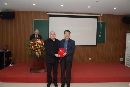 会上,郑直为许昌分会新当选会长胡国伟颁发聘书,两人共同为许昌学院校友会许昌分会揭牌。潘春彩为校友分会副会长、分会秘书长、副秘书长颁发聘书。新当选许昌分会会长胡国伟、校友代表李磊磊依次发言。(图片由校友工作办公室提供)