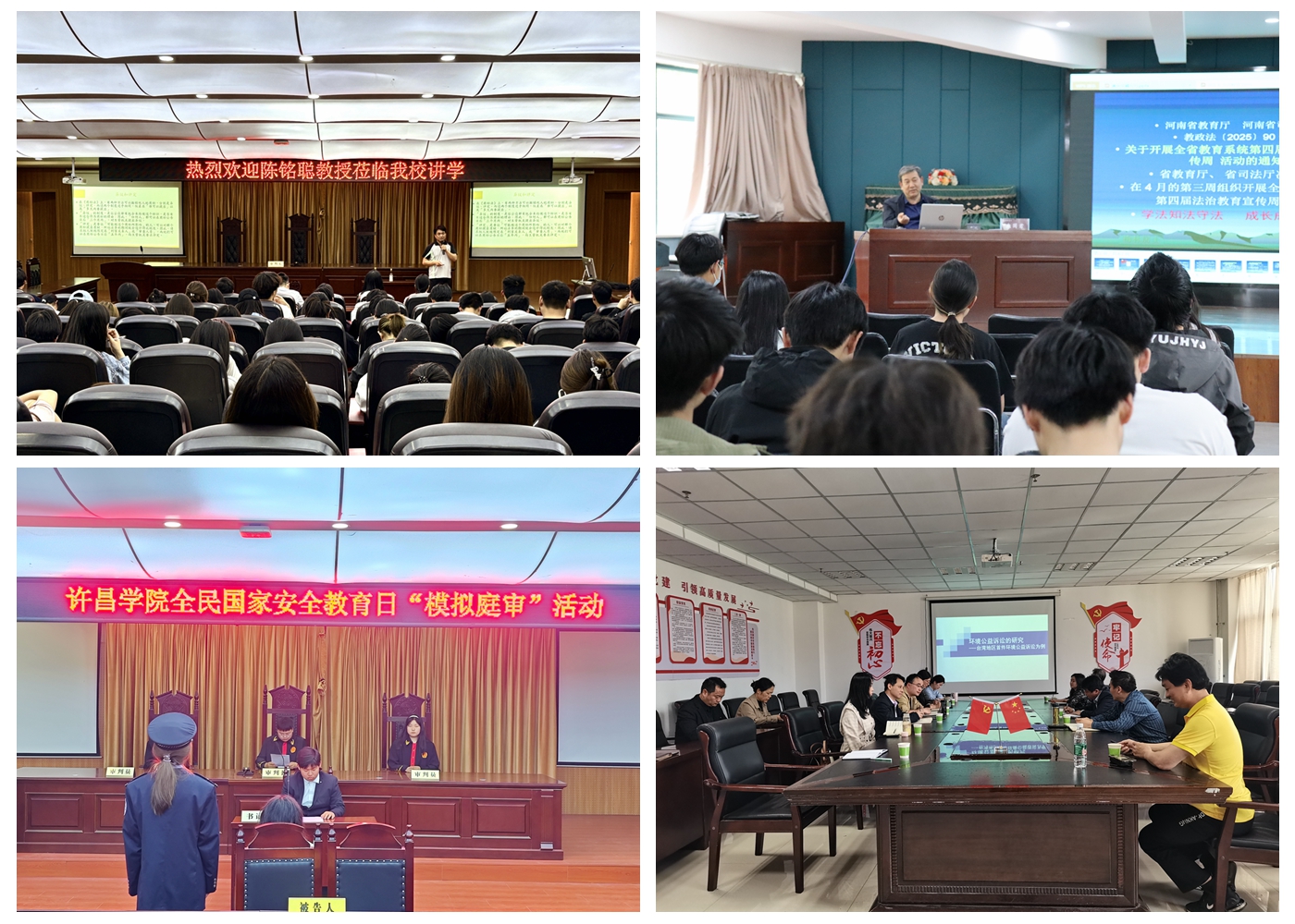 学校高度重视第四届法治教育宣传周活动,制定专项工作方案,成立了由主管法治工作的副校长任组长,由党委学生工作部、法制办公室、保卫处、法学院等单位主要领导组成的活动领导小组,学校各单位围绕《中华人民共和国教育法》《中华人民共和国国家安全法》开展专题宣传教育,通过在学院网站上发布相关法律法规文件、利用LED显示屏、学院橱窗、横幅、集体学习等形式宣传法治教育,进行相关法治宣传。学校邀请专家以国家安全教育和知识产权为主题进行专场讲座、法学院师生通过“模拟法庭”形式鲜活再现刑事案件庭审现场、各二级学院举办“法治宣传”主题班会等多种形式形成许昌学院普法特色,使普法活动入脑、入心,增强了学校师生的法治意识和法律素养。(图片由法制办公室提供)