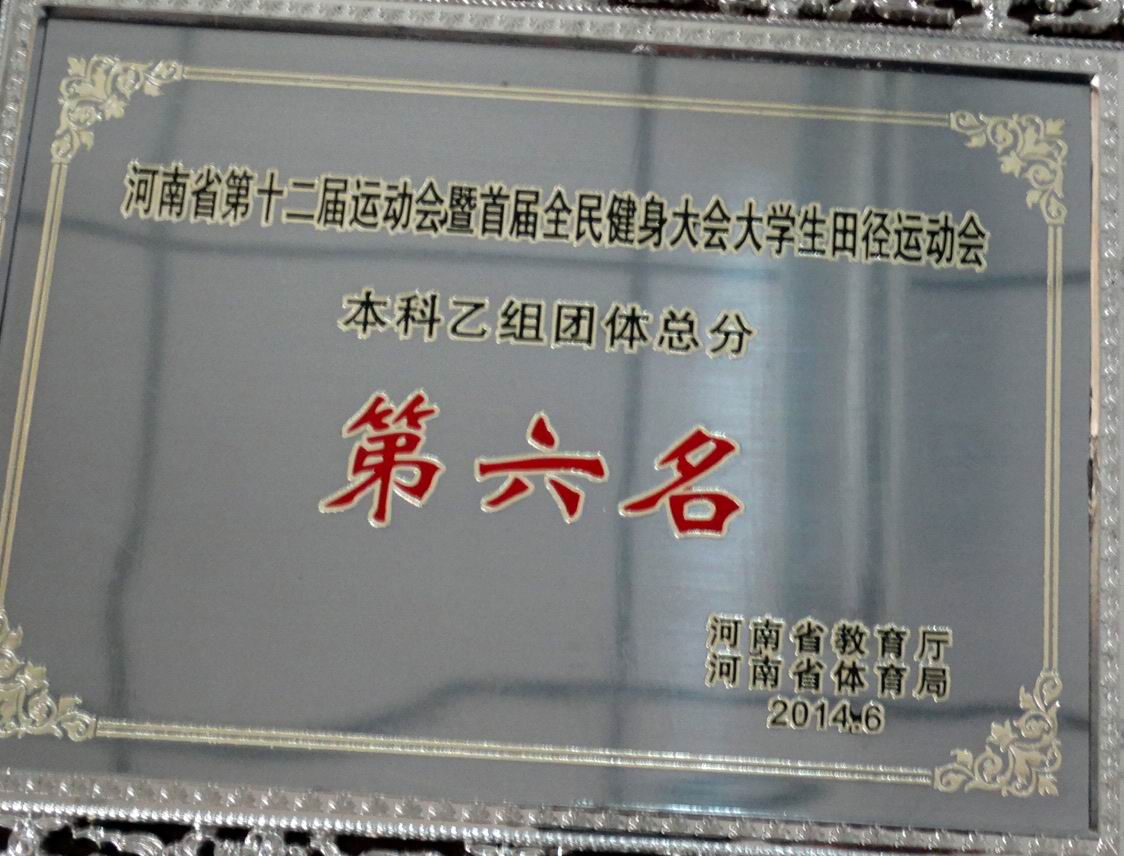 6月13日,河南省第十二届运动会暨首届全民健身大会“广义杯”大学生田径运动会在信阳职业技术学院胜利闭幕。体育学院代表我校夺得本科乙组男子团体总分第3名,并以总分91分的好成绩夺得本科乙组团体总分第6名,这是我校自2006年来第4次闯入本科乙组团体前6强,充分展示了我校体育专业良好的教学和训练水平。