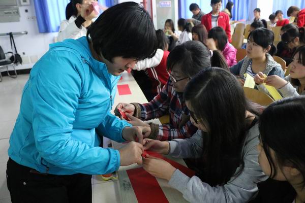 活动采取互动式体验教学形式进行。教育科学学院的手工制作专业教师高建芳、陈瑞现场教学,分别详细演示了心形纸盒、布艺、缎带头花等创意手工制品的做法。同学们按照步骤,兴致盎然地边学边做;学院工艺坊社团的成员分散在各组,全程配合老师,手把手地指导大家现场体验制作各类作品。