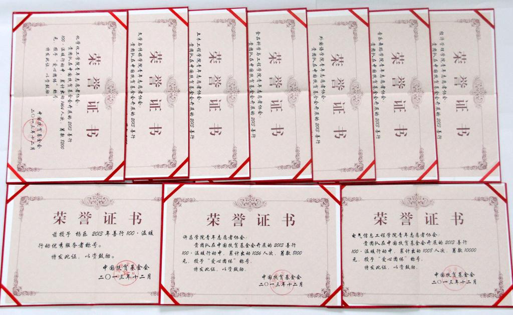 在历时58天的活动过程中,我校青年志愿者们不畏严寒,全情投入,利用课余时间游走在许昌市各个人流量较大的公共场所对路人进行劝募,即使遭遇冷眼与质疑也耐心解答,从容应对。到活动截止,我校青年志愿者们共募捐到善款104716元,累计参与活动1425人次,在全国参与活动的120余所高校中名列26位,得到了中国扶贫基金会及社会各界的一致好评。最终,我校青年志愿者协会和电气(机电)工程学院、土木工程学院、音乐舞蹈学院、外国语学院等八个院系青协分会在2013“善行100”温暖行动中被授予“爱心团体”称号,青年志愿者协会指导老师杨乐被中国扶贫基金会授予“优秀服务者”荣誉称号。