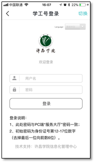 (1)扫码下载/安装 (2)选择“学工号” (3)选择“许昌学院”进行登录