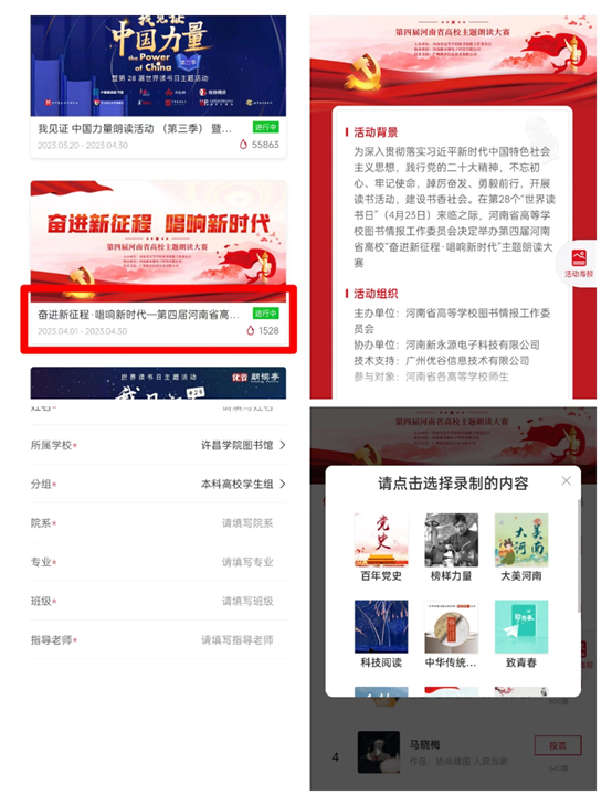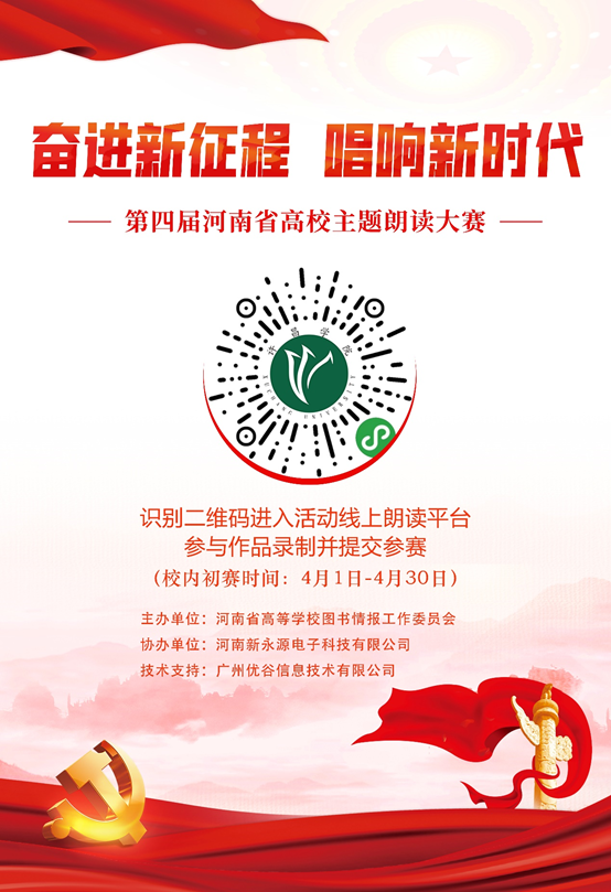 为深入贯彻落实习近平新时代中国特色社会主义思想,践行党的二十大精神,不忘初心、牢记使命,踔厉奋发、勇毅前行,开展读书活动,建设书香社会,在第28个“世界读书日”(4月23日)来临之际,河南省高等学校图书情报工作委员会决定举办第四届河南省高校“奋进新征程·唱响新时代”主题朗读大赛,现将有关事项通知如下: