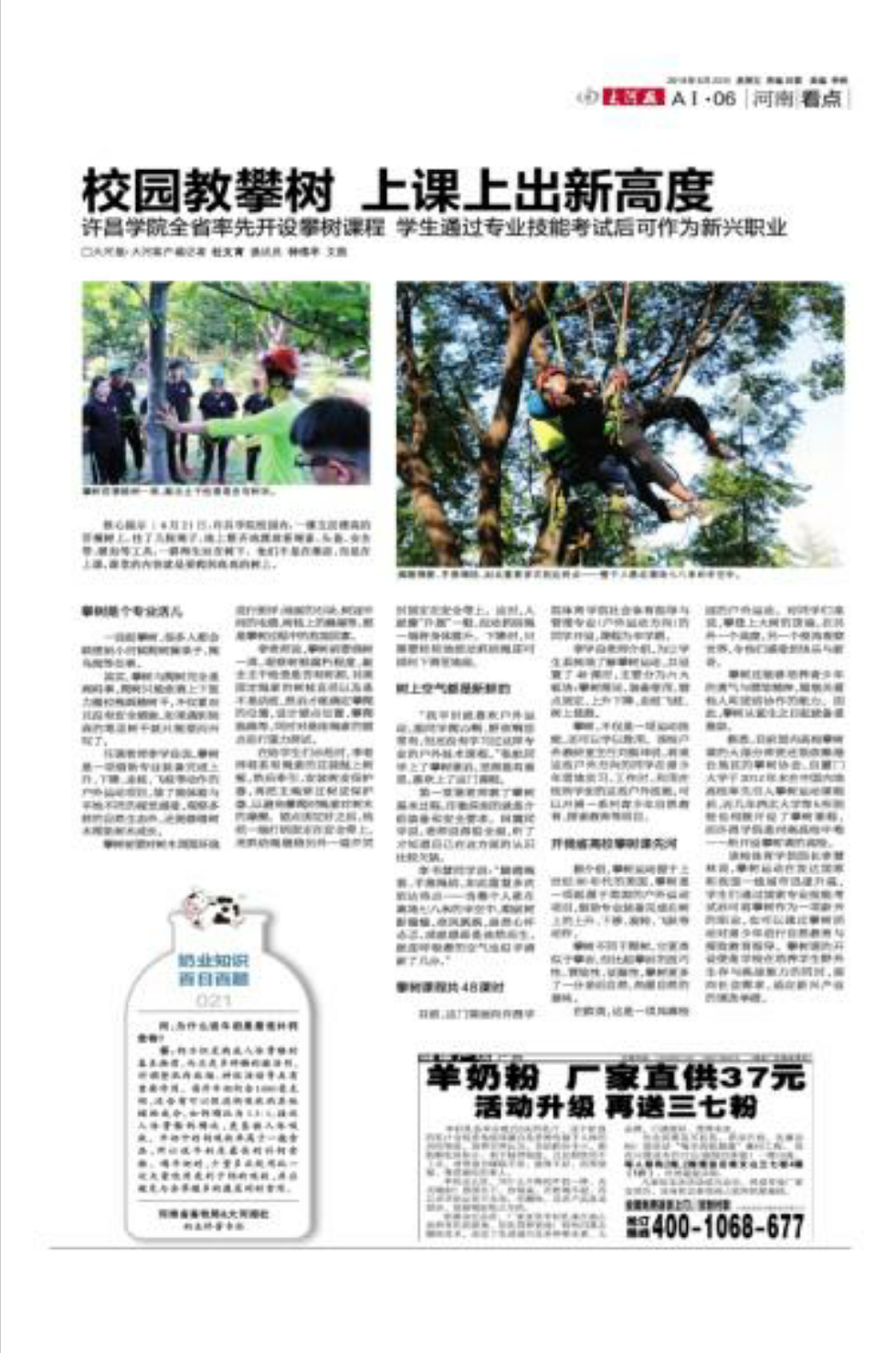 据悉,目前国内高校攀树课的大部分师资还很依赖港台地区的攀树协会,自厦门大学于2012年末在中国内地高校率先将引入攀树运动课程后,近几年西北大学等5所院校也相继开设了攀树课程,而许昌学院是河南高校中唯一一所开设攀树课的高校。