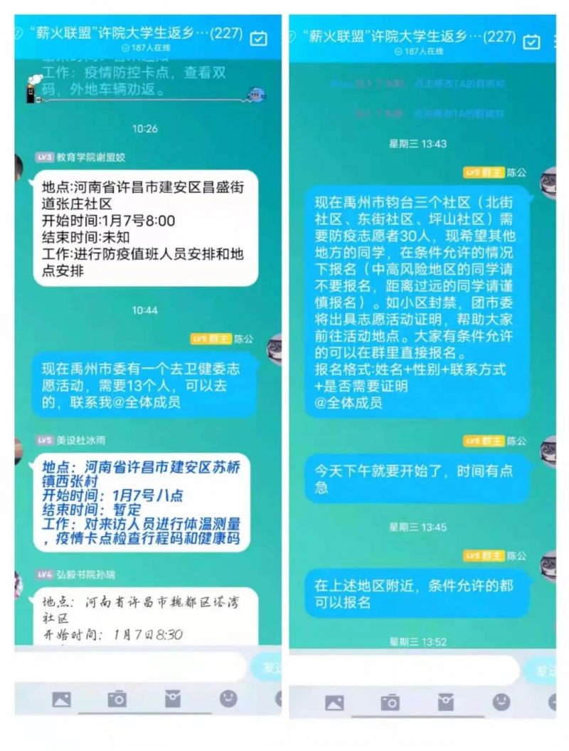 与此同时,来自许昌学院的两支青年志愿者队伍通过网络迅速集结,几百名禹州籍大学生闻令而动,扛起责任投身抗疫一线,在当地疫情防控中贡献出青春力量。