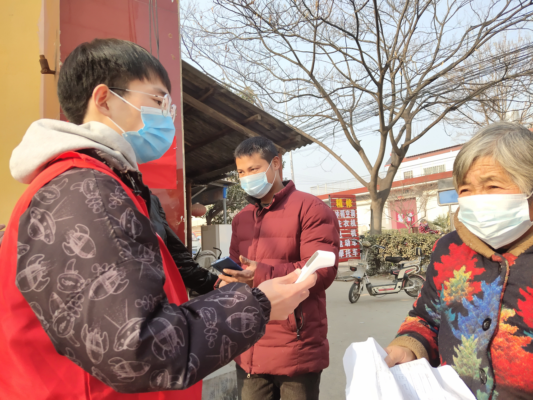 许昌学院电气与机械工程学院2019级学生陈公(左一)为核酸检测人员测温。 钟伟平供图