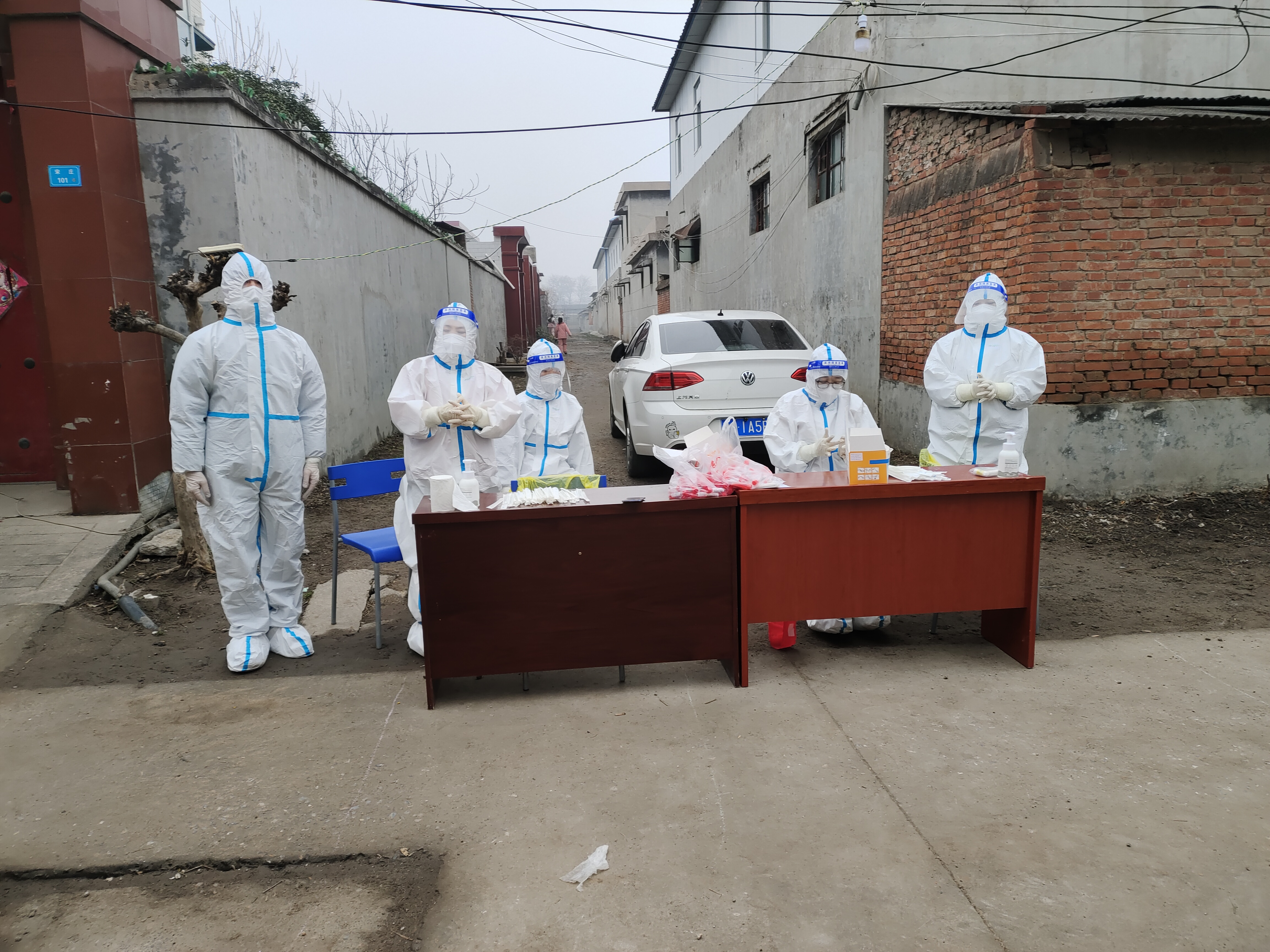 许昌学院化工与材料学院2020级学生张涵博(左一)身着防护服在核酸检测点。 钟伟平供图