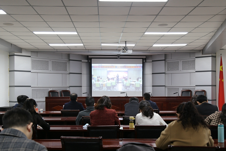 2 月 28 日,由中共河南省委教育工委、河南省教育厅主办,商丘师范学院、商丘市教育体育局承办的2022年春季开学思政第一课暨大中小学思政课集体备课活动如期举行。许昌学院在办公楼第三会议室设立分会场收看视频直播。校党委副书记孙海,党委宣传部、马克思主义学院单位负责人,全体思政课教师和其它学院部分教师代表共60余人参加分会场直播活动。