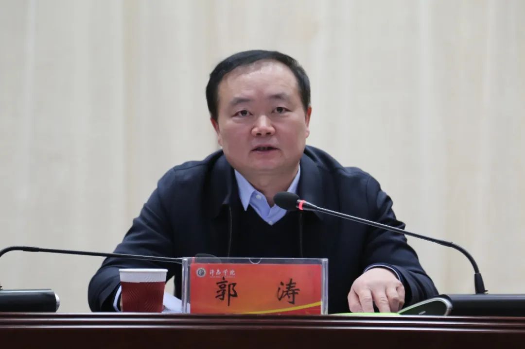校党委书记郭涛在会上讲话。他指出,2023年是学习宣传贯彻党的二十大精神的开局之年,也是学校改革攻坚之年。一年来,在省委、省政府和省委教育工委、省教育厅的正确领导下,学校领导班子统筹推动疫情防控和事业发展,积极克服疫情带来的不利影响,主动融入全省创新驱动、科教兴省、人才强省战略,团结带领全校广大师生,攻坚克难、开拓创新,学校高水平应用型大学建设迈出了更加坚实有力的步伐。要凝心聚力促发展,鼓足干劲开新局,不断加压奋进,进一步开创学校高水平应用型大学建设新局面。