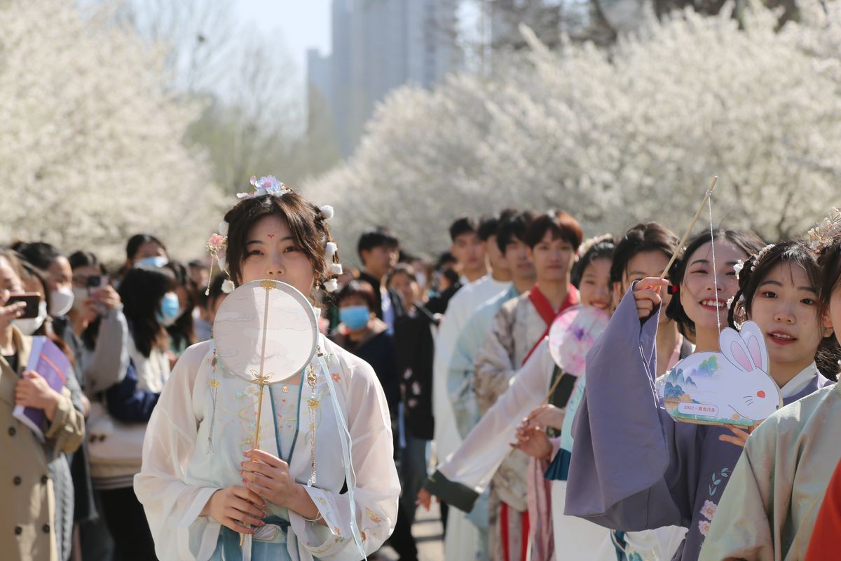 漫漫樱花路,翩然雪絮中。许昌学院闻理路上的690棵樱花树当下正值盛花期,学校第五届樱花文化节正式启幕。丰富多彩的文化活动让校园里顿时热闹起来,“春知樱觉”“樱花漫舞”等歌舞表演唱出了新时代青年学生的新期待,“华夏霓裳”汉服展示、“樱邀赴约”国潮集市、“樱香雅韵”茶艺表演等活动让优秀的传统文化穿越时空焕发了新的活力,“共度光樱”春日樱花宴、“樱有尽有”工艺品展示、“樱花之约”石英砂画制作等以樱花为主题的文创产品,吸引师生驻足围观。
