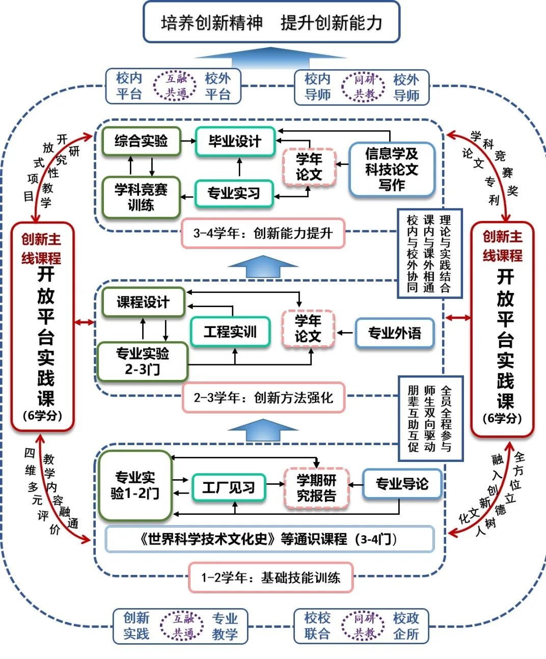 构建开放性创新教学体系。以贯穿本科学程的《开放平台实践课》(6学分)为主线,将通识教育、创新实践与专业教学相结合,打造创新课程群(40-45学分)。打破传统课堂教学的时空壁垒,实施研究性教学,依托校内外开放性创新平台,学生在校内外导师的带领下全员全程参与科技创新课题研究,实现师生双向驱动,朋辈互助互促。实施三层次创新训练计划,从基础技能训练,到创新方法强化,再到创新能力全面提升,贯穿四年本科学程。形成了理论与实践、课内与课外、校内与校外相融通的“产学研教科创一体化”创新实践网。