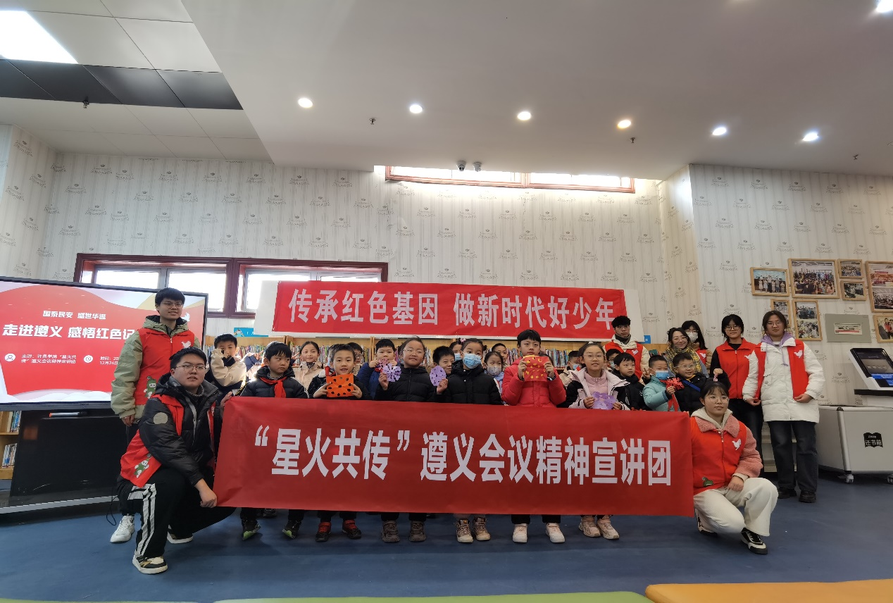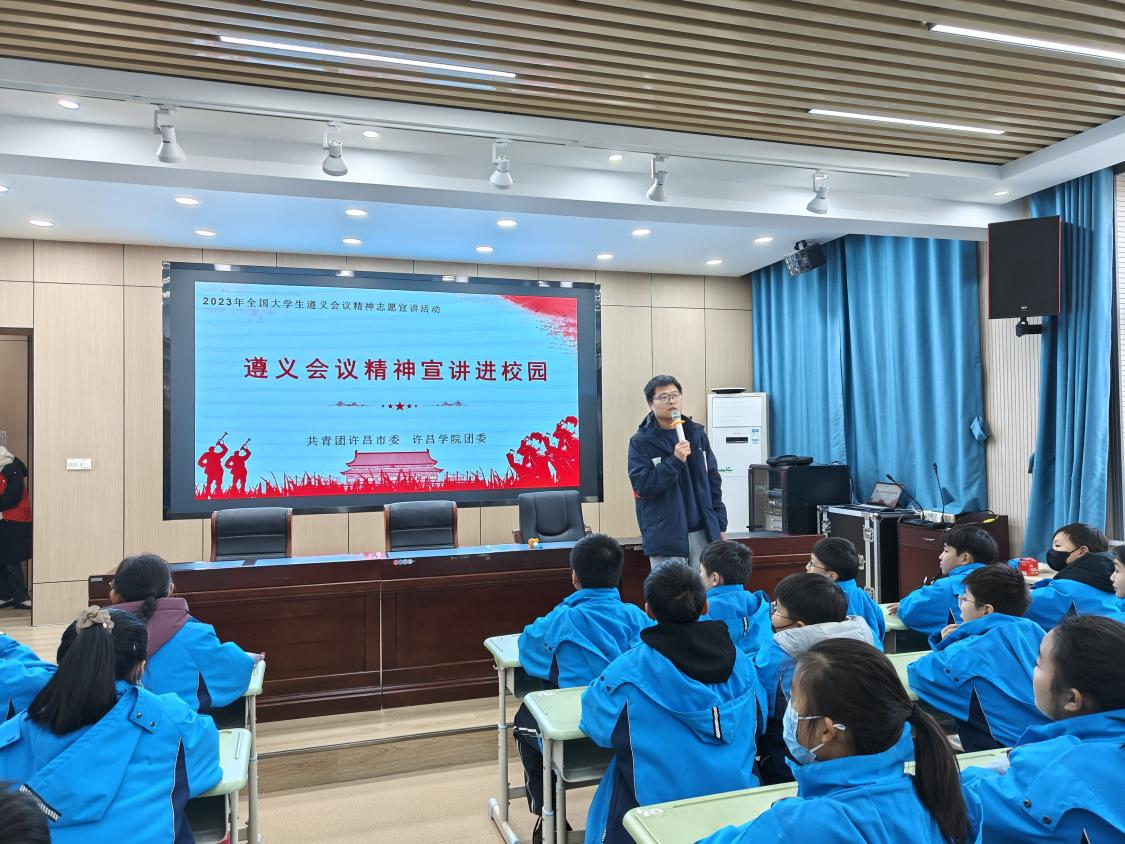 走进中小学,激发爱国热情。2023年12月,“星火共传”遵义会议精神宣讲团分别奔赴许昌市兴业路小学、许昌市实验小学、许昌市一中开展宣讲活动。“为什么红军可以以3万兵力打败国民党30万兵力?”面对学生提问,宣讲团耐心解答。在这一问一答的互动中让大家再次感受到伟大革命先烈坚持马克思主义和共产主义的坚定信念,使同学们进一步领悟了“坚定信念,坚持真理,独立自主、团结统一”的遵义会议精神内涵。这一刻校园里的红色精神遍地开花,同学们筑牢信仰之基、补足精神之钙、把稳思想之舵。