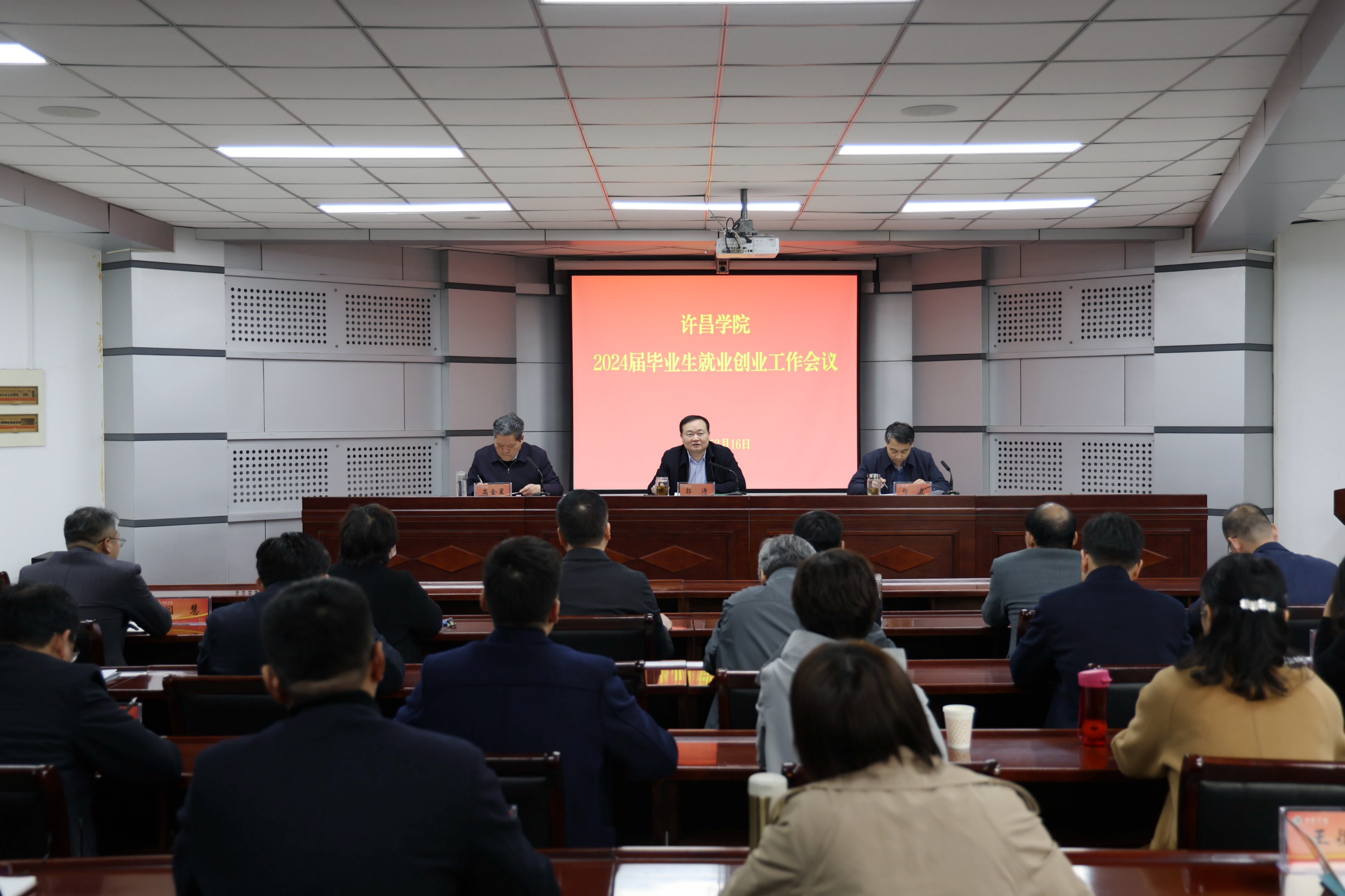 3月16日上午,许昌学院在办公楼第三会议室召开2024届毕业生就业创业工作会议。校党委书记郭涛、校长郑直、副校长高金星出席会议。学校大学生就业创业工作领导小组成员单位主要负责人,各二级学院党委书记、院长、党委副书记及就业专干、毕业班辅导员参加会议。