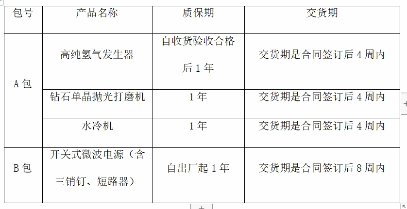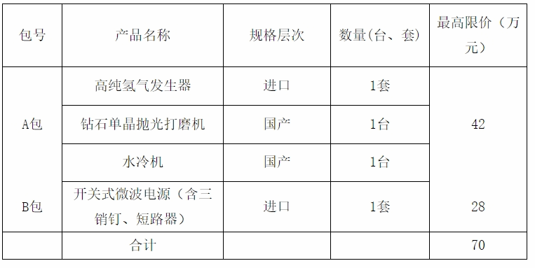 A包:宝石级单晶金刚石外延生长技术开发项目相关设备购置;包括高纯氢气发生器1套、钻石单晶抛光打磨机1台、水冷机1台的采购、供货、运输、保险、装卸、安装、检测、调试、试运行、验收交付、培训、技术支持、售后保修及相关伴随服务等(具体采购内容及要求详见比选文件)。