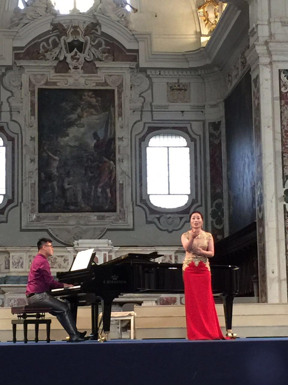 比赛中,我校音乐舞蹈学院李卫玲老师以歌剧《托斯卡》中托斯卡的咏叹调《为艺术,为爱情》;歌剧《图兰朵》中柳儿的咏叹调《你那颗冰冷的心》;歌剧《蝴蝶夫人》中蝴蝶夫人的咏叹调《晴朗的一天》等作品突围、进决赛并斩获桂冠。她的演唱水平得到了五位国际评委专家的一致认可和赞许。在国际评委专家集体推荐下,李卫玲老师代表中方优秀选手在卢卡市百年来首次对外开放的圣罗马大教堂中为来自世界各地的艺术家献唱《晴朗的一天》,受到世界各国观众们的广泛好评。(图片由音乐舞蹈学院提供)