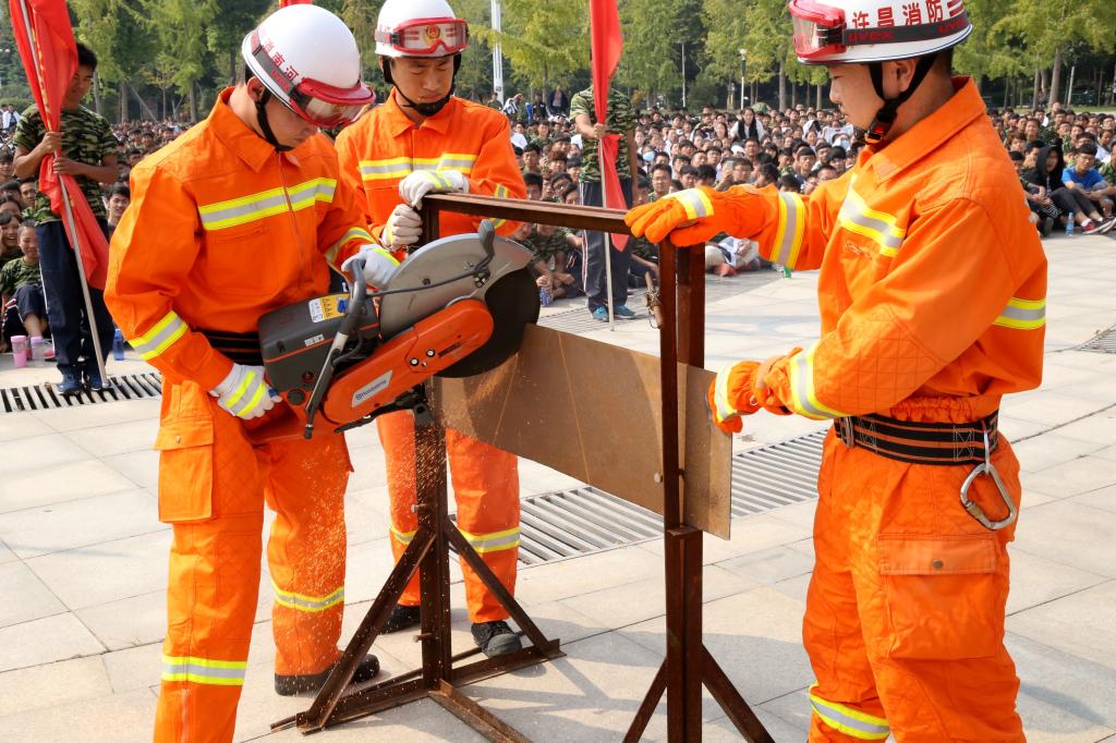 活动开始后,许昌市公安消防支队官兵进行消防技能展演,现场展示了“两人五盘水带连接操”、使用钢筋切断器迅速斩断钢筋、使用切割机切割钢板等消防技能,并介绍了十多种消防安全用具。最后,许昌市公安消防支队法制宣传科科长李孝猛为16级全体新生讲授消防安全知识和技能。