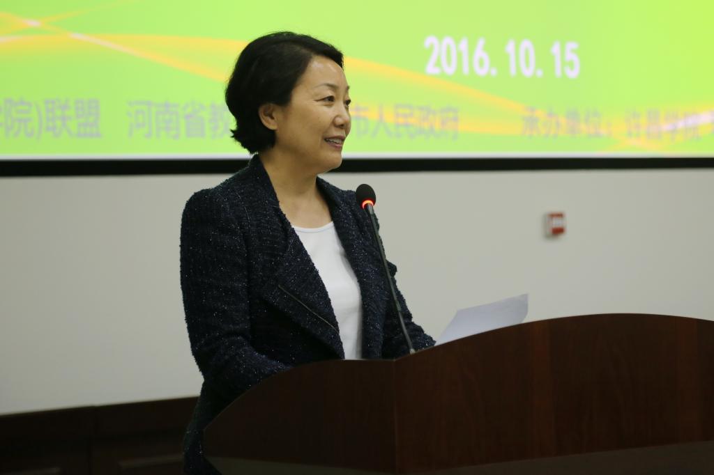 教育部学校规划建设发展中心规划与研究处刘志敏处长在大会上讲话。他说,教育部在2014年发出了产教融合宣言,两年来转型发展在波澜壮阔的推进中。河南、许昌始终是走在前列,这次专业协作会的成立又是标志性的成果。近年来许昌学院在绿色科技、绿色创新、绿色活动上做出了系统性设计。所有联盟成员也要发挥这样的示范引领作用,都应该成为区域绿色技术转移的中心,成为绿色教育绿色文明的辐射源。联盟要贯彻“共享”、“开放”理念,向企业开放、向政府开放,在开放中互通有无,共同成长,要多层面广泛交流,真正成为一家人、真正成为创新共同体;高校要构筑创新生态,要做基因的输出者,输出理念、输出设计、输出这些创新的“基因”,引导整个社会整个教育形成一个生机勃勃的创新体系;学校也要主动和政府、企业合作,构筑一个创新的生态,同时注重国际合作,成为价值的创造者、贡献者和奉献者。