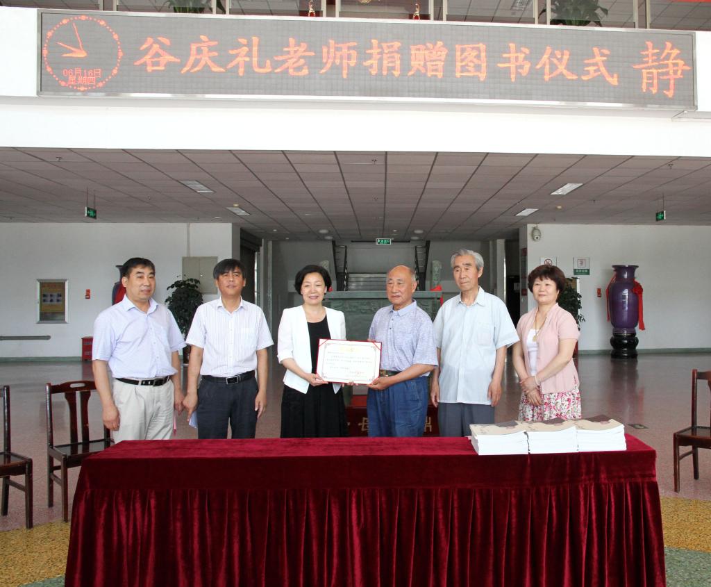 6月16日上午,谷庆礼老师捐赠图书仪式在图书馆二楼大厅举行。仪式上,中国书法家协会会员谷庆礼老师向我校图书馆捐赠了自己的书法作品集《庆礼写老子》。副院长黄怡俐出席仪式,许昌老年书画研究会、我校离退休工作处和图书馆相关负责人参加了捐赠仪式。