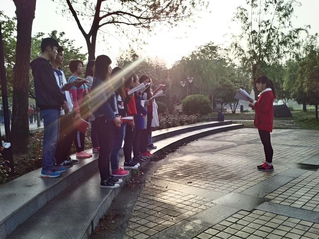 如果你起的够早,睡的够晚,那你一定能够时常听闻飘荡在许昌学院校园里的琅琅读书声。“我们每天坚持一起读书,风雨无阻!”负责人李天天说。李天天是体育学院的一名大四学生,每天早晨六点二十,她和她的小伙伴儿们准时现身,在校园的小湖边集合读书;晚上九点,在樱花大道的一排排路灯下,依旧有他们读书的身影。“我们主要读英语,这既可以学习英语,又可以通过读书开阔眼界,增长个人修养”,李天天如是说。跟一般读书不同的是,这些爱书人都选择用尽可能大的声音来朗读,“读书需要眼到心到口到,通过大声读书,我们记得更深更牢,而且大声朗读,可以练习气息,有益于身心健康。”这样日复一日每天坚持读书的学生有三十多人,他们来自不同年级不同院系,李天天表示,“以书会友,我们更开心!”