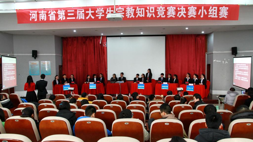 根据《河南省高校第三届大学生宗教知识竞赛活动方案》,我校和郑州大学、河南大学、河南师范大学、河南科技大学、河南财经政法大学、信阳师范学院、河南中医学院、中原工学院、安阳师范学院、郑州师范学院等11所片区夺冠高校角逐全省总决赛。比赛采用抢答赛的形式进行,分必答题、抢答题和风险题三个环节。比赛中,我校选手密切配合、沉稳应对、积极抢答,展现了丰富的知识储备和良好的团队合作精神。