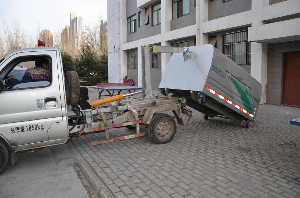 另外,后勤管理服务中心还于近日投资20余万元购买了20个可卸载式垃圾车厢。该车厢有液压升降装置,按动按钮,车载垃圾箱便挂在液压升降装置上,垃圾筒就可升起,该车可直接开赴至垃圾站。电动垃圾清运车对师生日常生活垃圾进行密封运输,在运输途中不会出现垃圾沿路抛撒的情况,避免了对环境造成的二次污染。