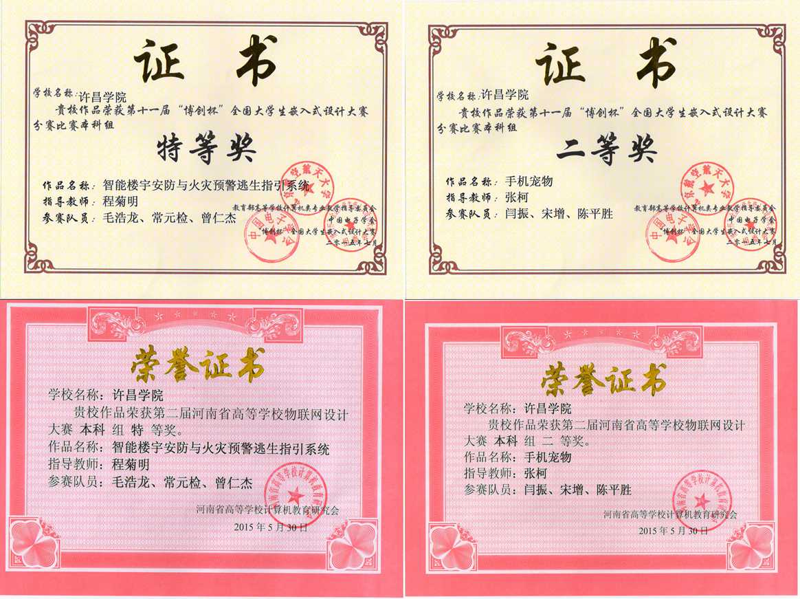 5月30日,第十一届“博创杯”全国大学生嵌入式设计大赛(河南赛区)暨第二届河南省高校物联网设计大赛在郑州轻工业学院举办,来自省内高校的近20支队伍参赛。我校共派出2支代表队参加了本次比赛并获佳绩。由程菊明老师指导,毛浩龙、曾仁杰、常元俭三位同学设计的作品“智能楼宇安防与火灾预警逃生指引系统”获得了河南省赛区本科组特等奖;由张柯老师指导,闫振、宋增、陈平胜三位同学设计的作品“手机宠物”获得河南省赛区本科组二等奖。获得特等奖的团队将于7月份首次代表学校参加在北京举行的全国总决赛。