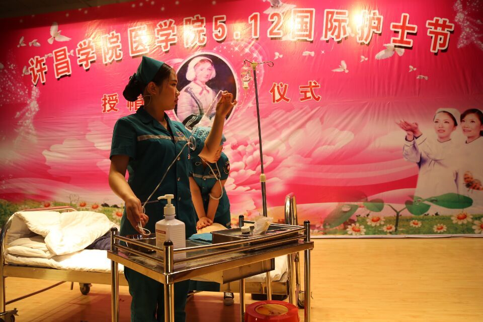 授帽仪式结束后,护理师生为大家展示了《心肺复苏》、《静脉注射》、《穿脱隔离衣》等护理技能。