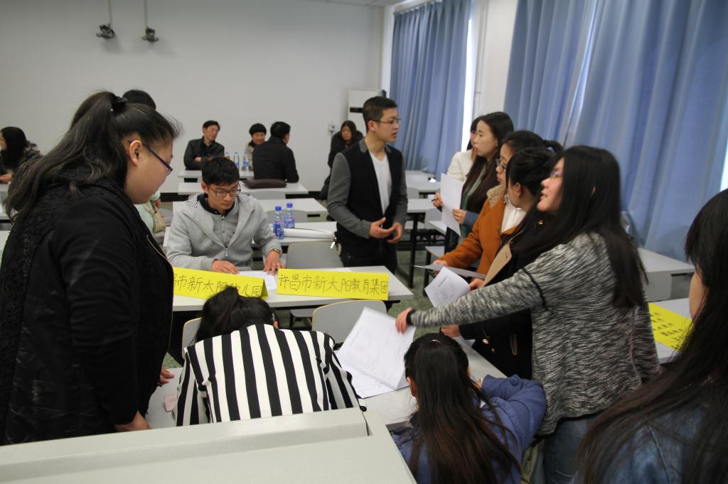 4月3日上午,教育科学学院在A3三楼学前教育实验室成功举办了2015届学前教育专业毕业生专场招聘会。河南省实验幼儿园、郑州幼儿体智能训练中心、常春藤幼儿园、许昌市新太阳幼儿园、部队幼儿园、两岸早教等10余家单位参加了招聘会。