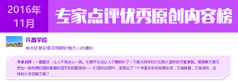 2016年9月至11月,在“腾讯&中国青年报”共同推出的全国578所高校校园号排名榜单中,我校QQ校园号(xcu1942)先后获得“全国高校校园号排行榜”10月份榜单第六名、11月份榜单第八名的好成绩,原创文章《开学迎新直播---学长学姐带你逛许院》《表白|许院14级的薛汐,我一生长情只为你》《有关欣赏初雪及照顾好南方人的通知》先后荣登专家点评“优秀原创内容榜”。