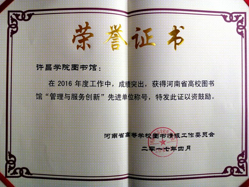 近日,在河南省高校图书馆2017年工作会议上,我校图书馆荣获2016年度河南省高校图书馆“管理与服务创新”先进集体称号。