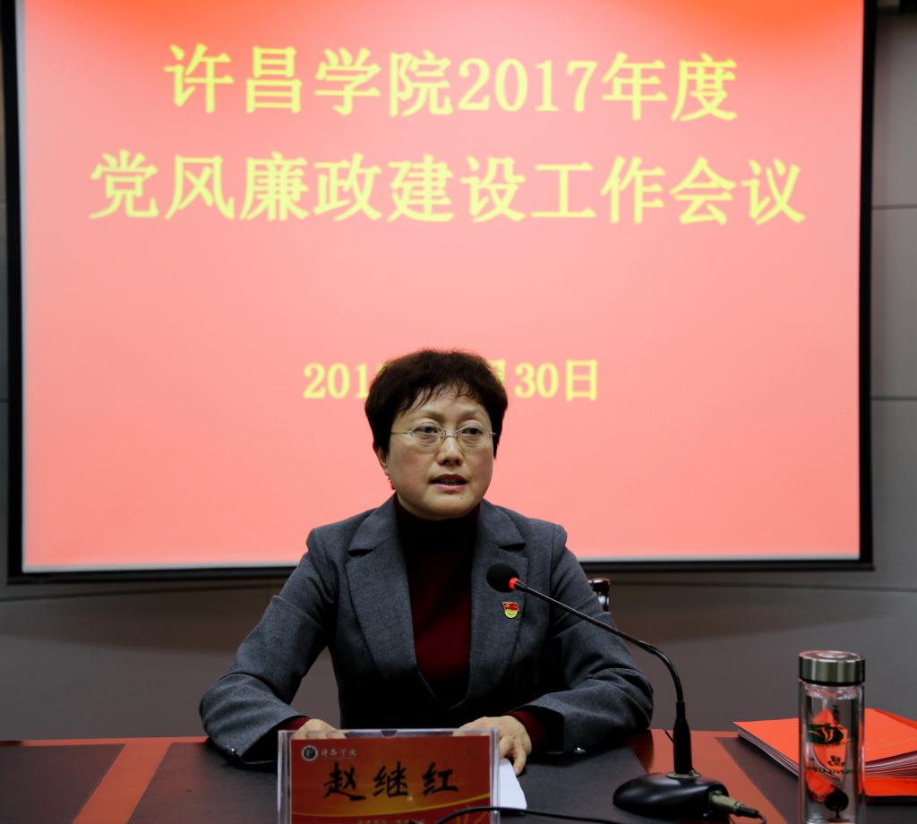 党委副书记、院长赵继红在会上讲话。她说,要做好党风廉政建设工作,我们各级领导干部要做到履职尽责、不忘初心、砥砺前行。一是党委要切实担负起全面从严治党的主体责任。党的各级组织要自觉把管党治党、从严治党责任扛在肩上,牢固树立抓好党建是本职、不抓党建是失职、抓不好党建是渎职的责任意识。要强化“党政同责”、“一岗双责”,真正做到党委“不放手”、主要领导“不甩手”、班子成员“不缩手”、纪委“不松手”。严肃考核问责,健全完善考核评价制度,严格落实《中国共产党问责条例》。二是纪委要切实担负起全面从严治党的监督责任。校党委将全力支持纪检监察部门持续深化“三转”,确保纪检监察部门聚焦主业依纪依法履行职责。纪检监察部门要切实履行监督职责,突出监督重点,强化监督检查,加强落实中央八项规定精神及省委省政府若干意见规定的日常检查和年节假期的重点抽查,对查出的问题决不姑息。三是作风建设要常抓不懈,久久为功。要以解决“四风”问题为突破口,持续发力,久久为功,坚决把积弊旧习清除掉,使党的作风全面过硬。要把作风建设拓展延伸到教学、科研、管理服务等各个领域,融入党的建设的各项工作;要加强师德师风建设,继续开展“强师德、练师能、正师风、铸师魂”活动,进一步完善师德考评机制,增强广大教职工的职业操守;要进一步强化党政管理人员服务意识、廉洁意识,规范权力运行,坚决破除衙门作风,以优良的党风带师风,转教风,引学风,促校风。